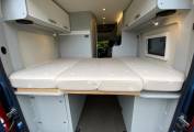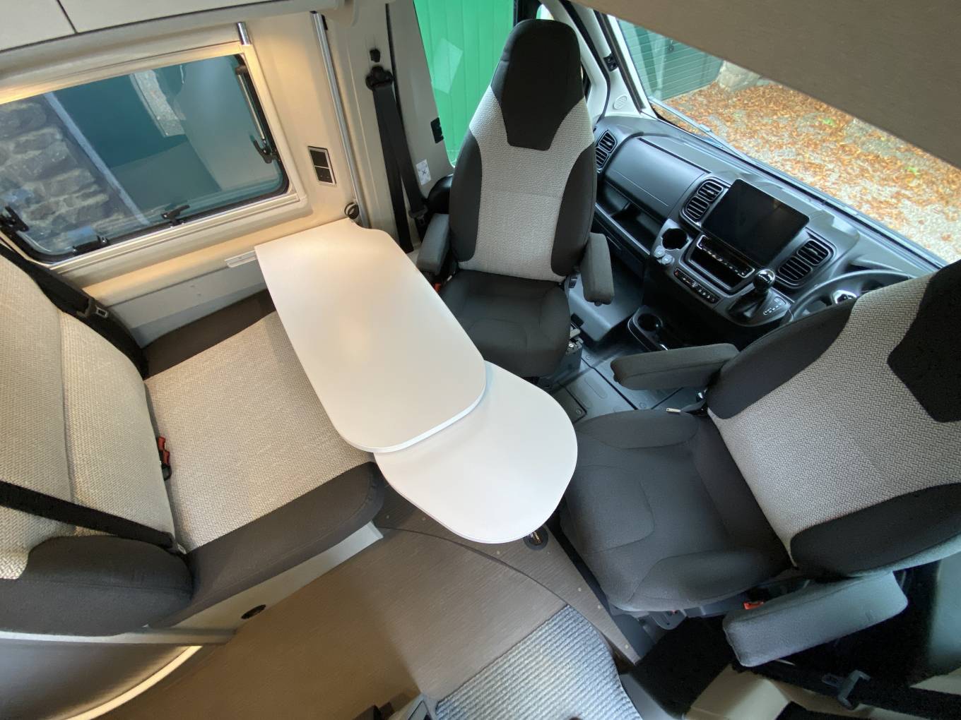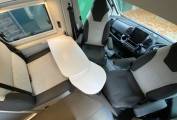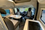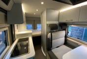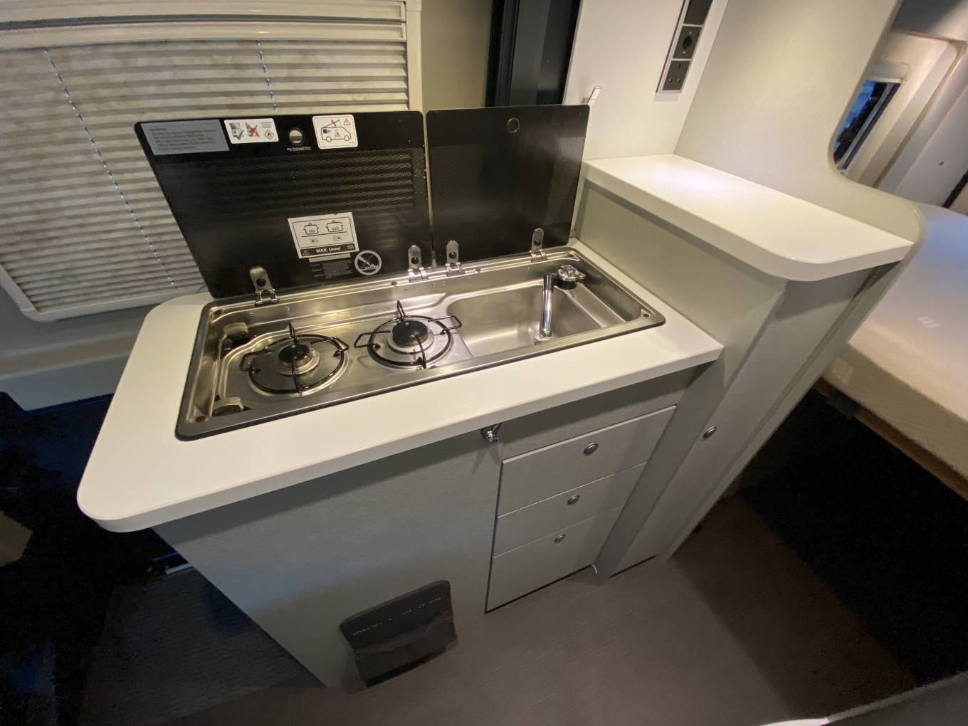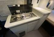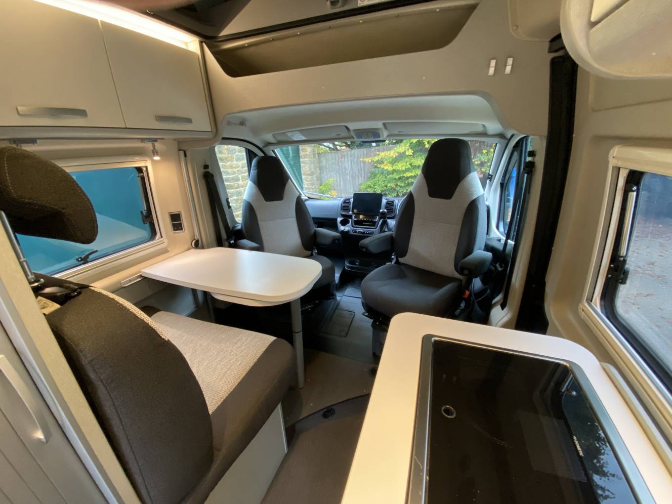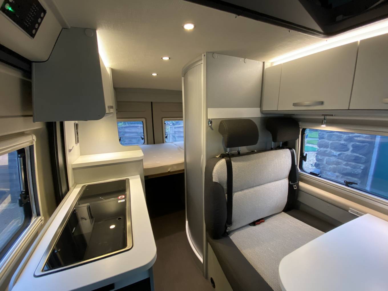 Outside there is a Thule wind out awning, Pop-top in contrasting black, 16 inch 5 spoke alloy wheels, full habitation door flyscreen, awning LED strip lighting, gas locker with space for two bottles, reversing camera, rear parking sensors, towbar, electric entry step and mains hook up point.