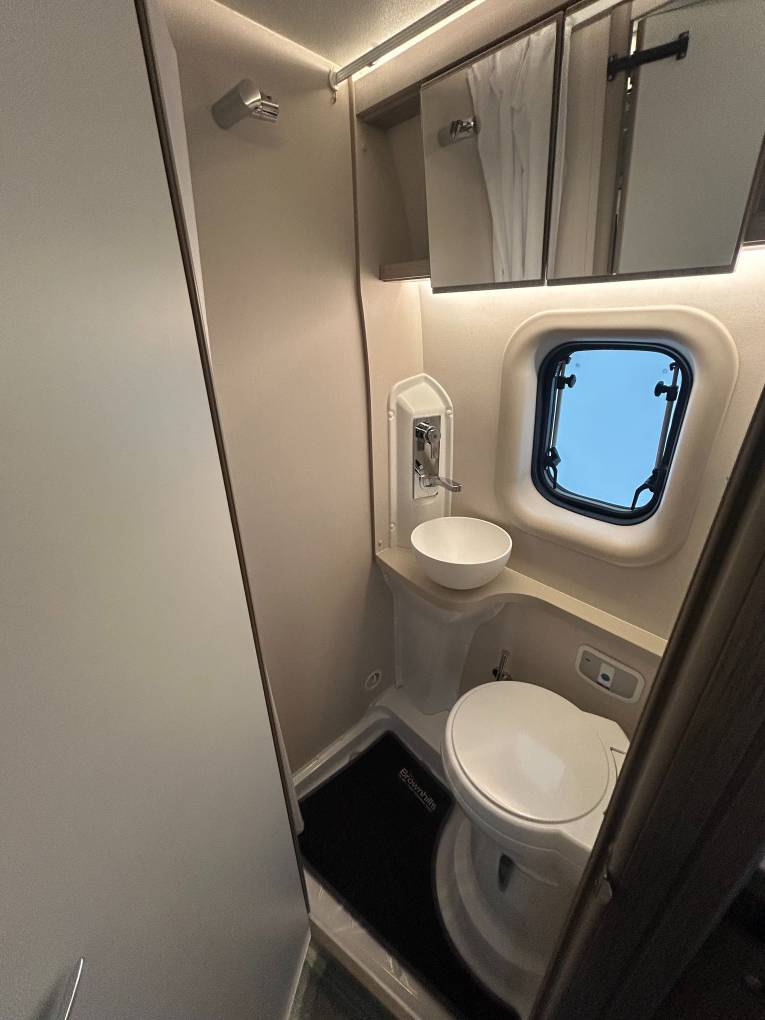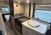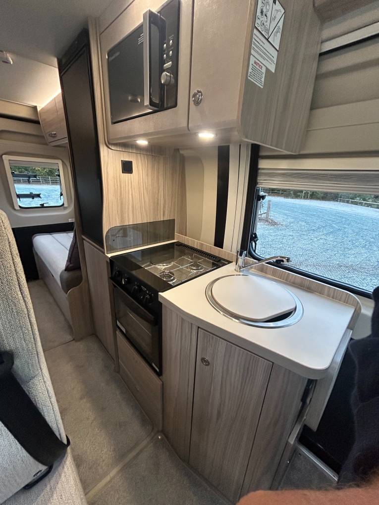 The kitchen is fully equipped to prepare meals on the go, featuring an oven, grill, gas hob, microwave, and a 3-way fridge freezer. The washroom includes a cassette toilet, shower, sink with mixer tap, mirror, and practical storage.