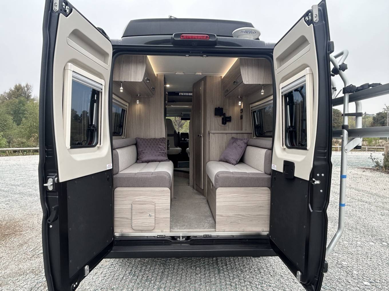 At the rear, you’ll find a spacious lounge with two bench seats that convert into a large double bed, with ample storage both above and below. A TV bracket is also pre-fitted, ready for your entertainment setup. The pop-up roof reveals another generous double bed, making this a true 4-berth motorhome. Stay powered up with the solar panel and the whale heating system will keep you comfortable what ever the weather.