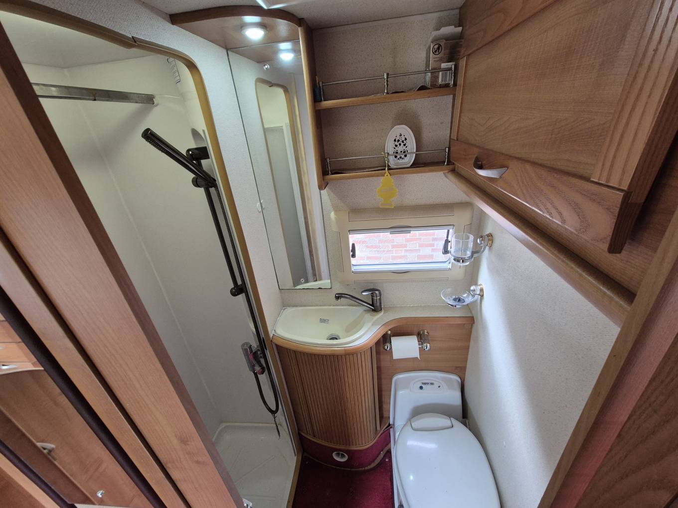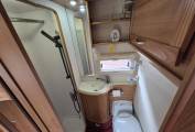 The washroom is spacious in size and houses the cassette toilet, handwash basin and separate shower.
