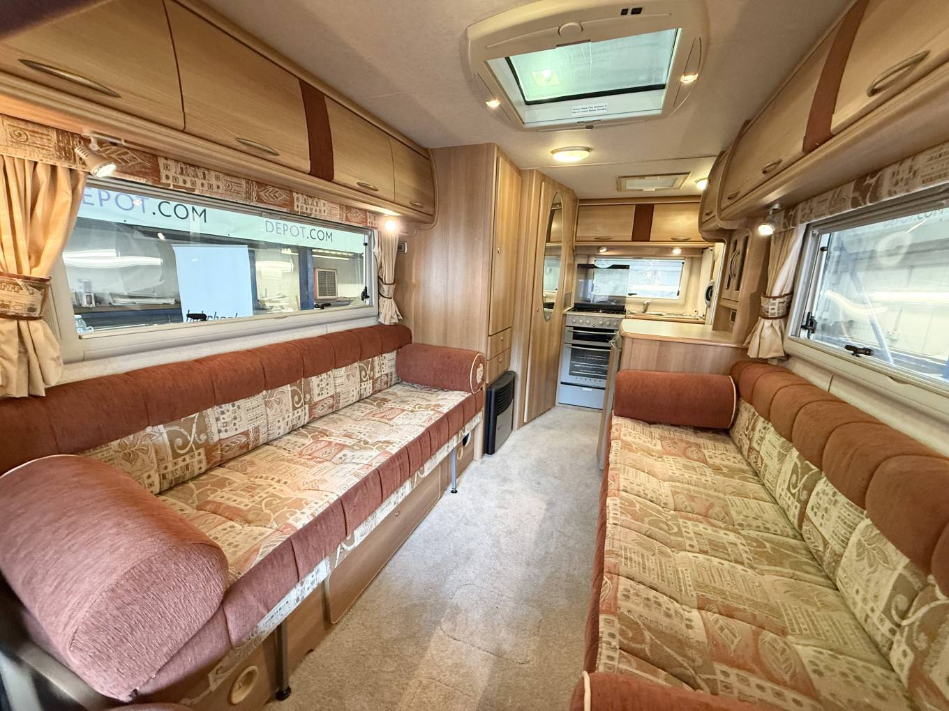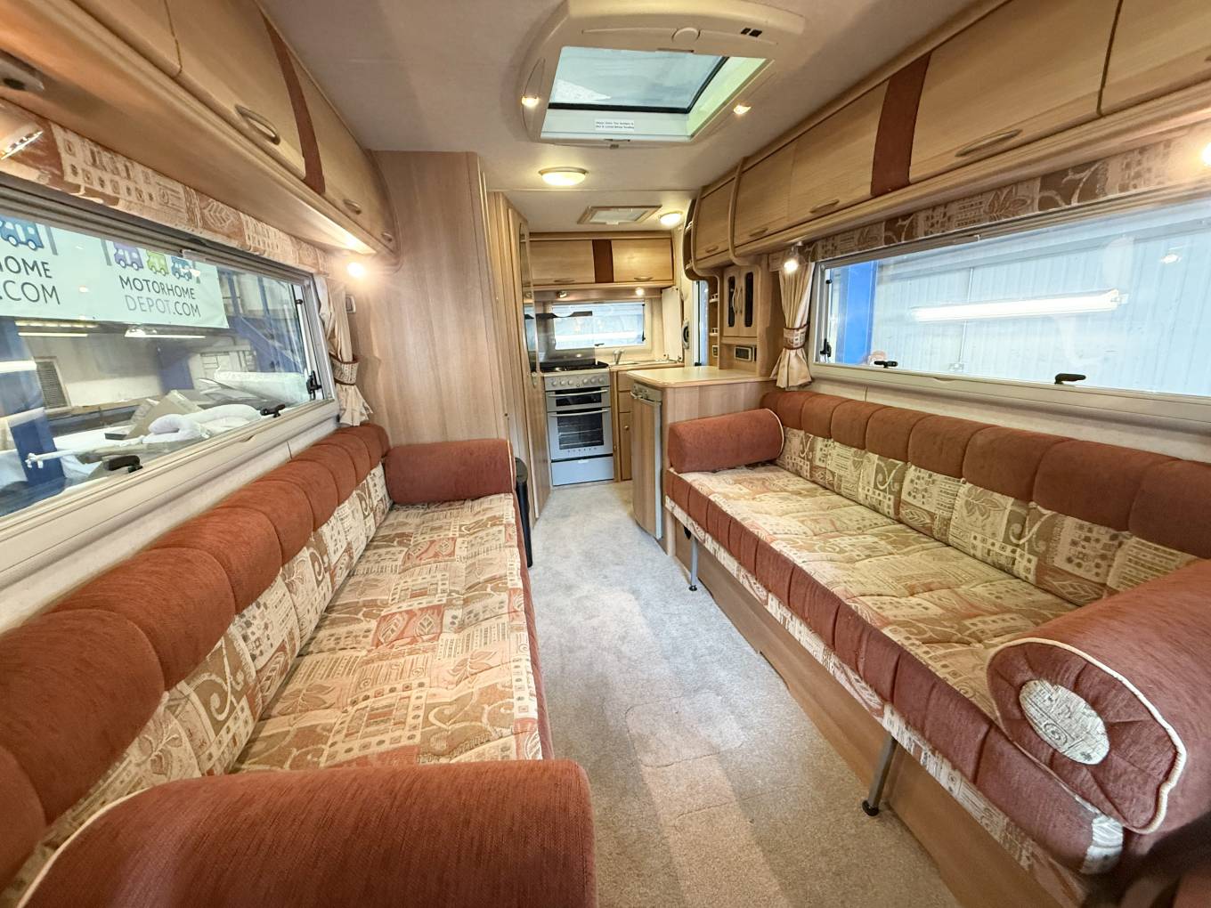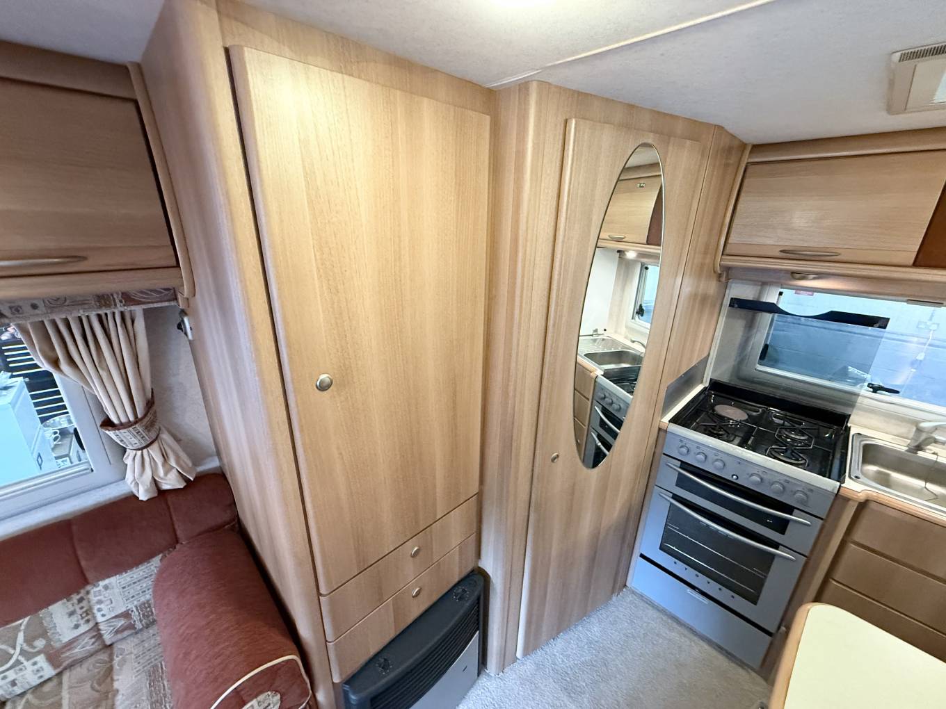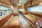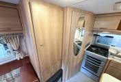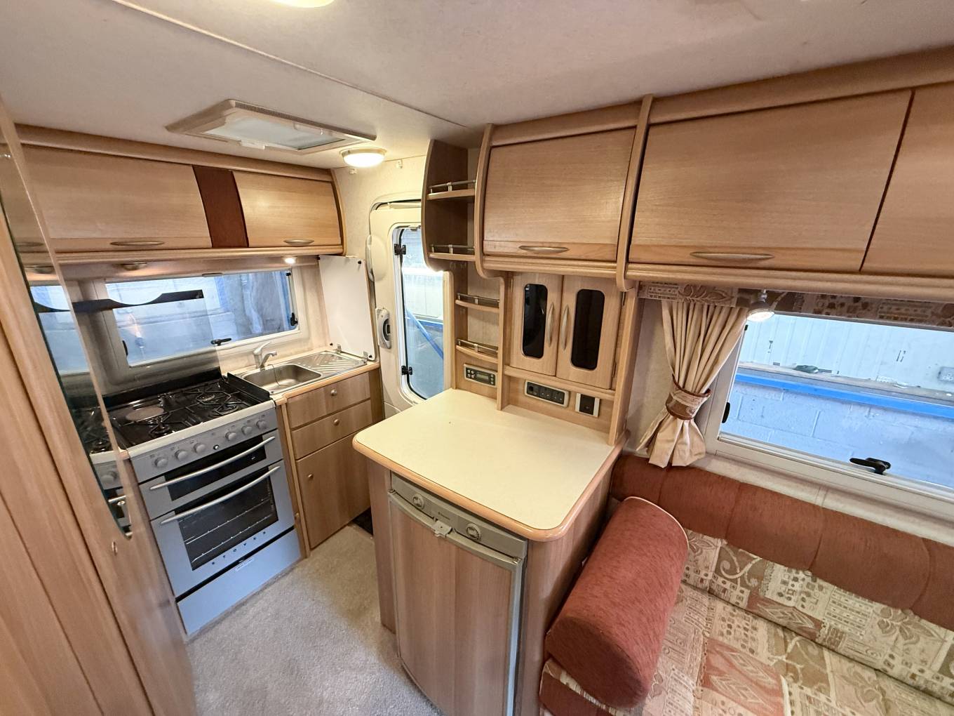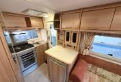 As you enter through the habitation door to the rear the kitchen is to your right, with a gas oven and grill with 3 gas rings and 1 electric hob plate, sink with mixer tap, worktop space and storage - both lower and eye level. This area benefits from a rear window as well as the habitation door for extra ventilation while cooking. To your left is the fridge with worktop space above and eye level storage.
