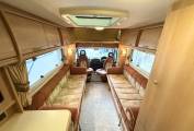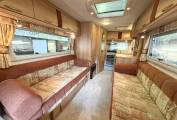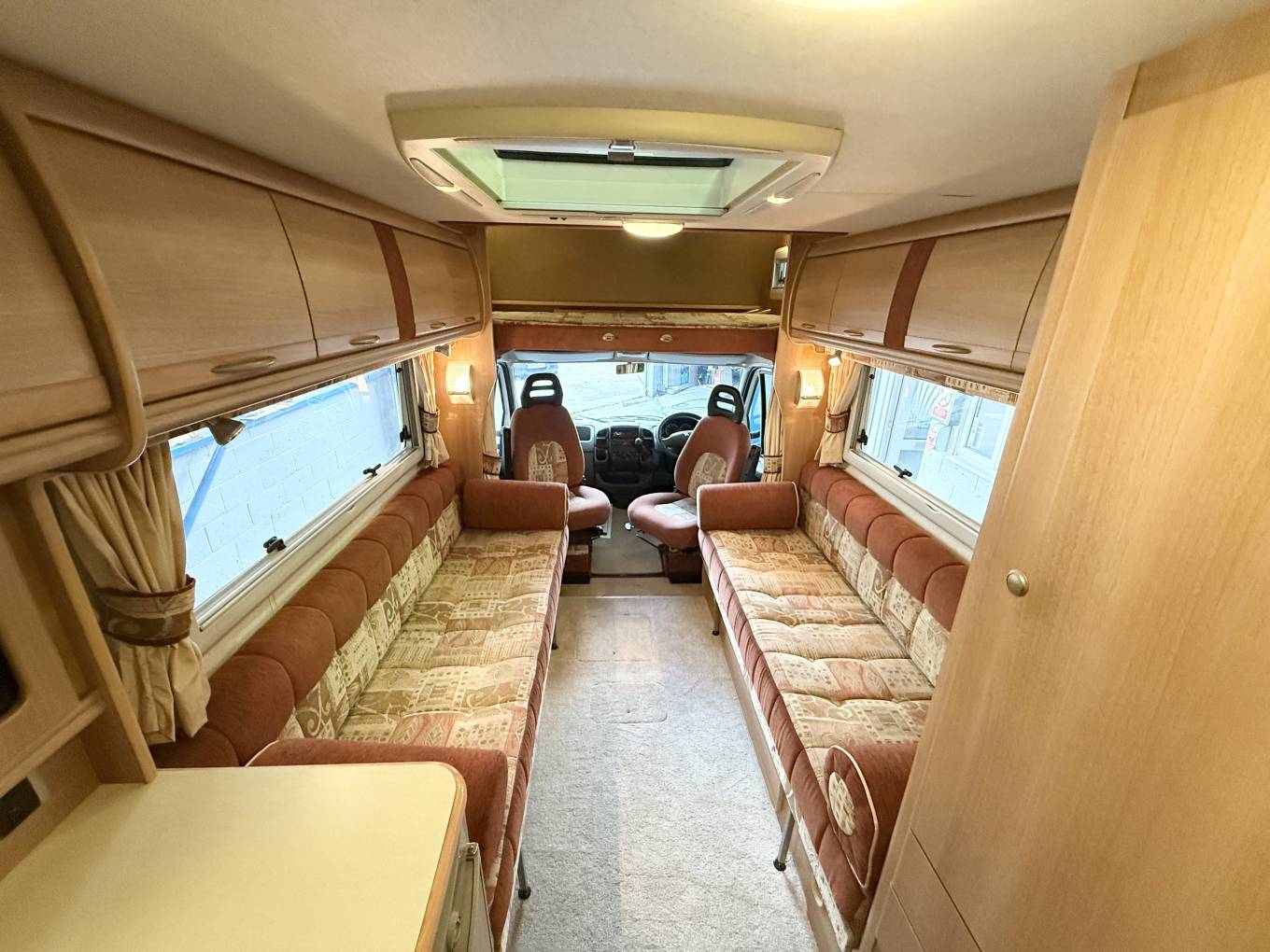 To the mid and front area of the motorhome are the 2 side-facing sofas for relaxation along with the swiveling driving seats for additional seating. A freestanding table stows away for convenience. These sofas can either be used as 2 single beds or can also nicely convert into a large double bed. Plentiful storage ensures you can take all your holiday requirement with you. over the cab is another large double bed or you can use for storage either.