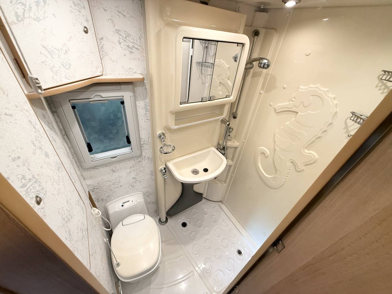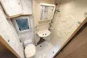 In the far corner is the shower room with shower, vanity sink unit and cassette toilet. The wash hand basin sits on a cleverly designed movable partition that creates the shower area and helps protect the toilet from water splashes.