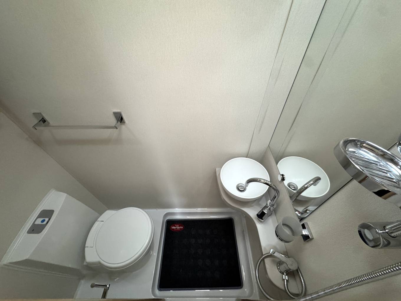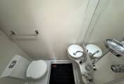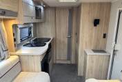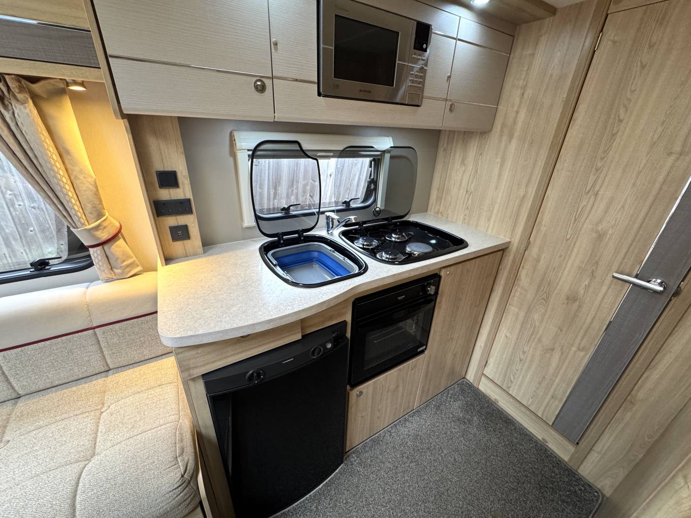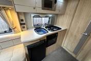 Inside, the front lounge features two side-facing bench seats that easily convert into a double bed. The rear kitchen includes a gas hob, oven, grill, sink, and fridge/freezer, with good storage throughout. The washroom has a cassette toilet, hand basin, and an integrated shower, all in a tidy, space-saving design.