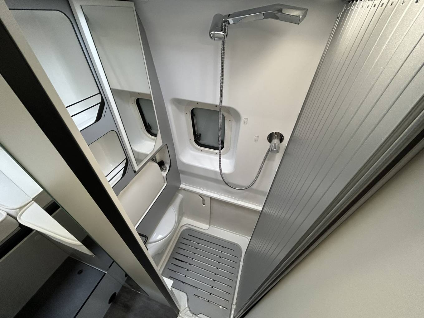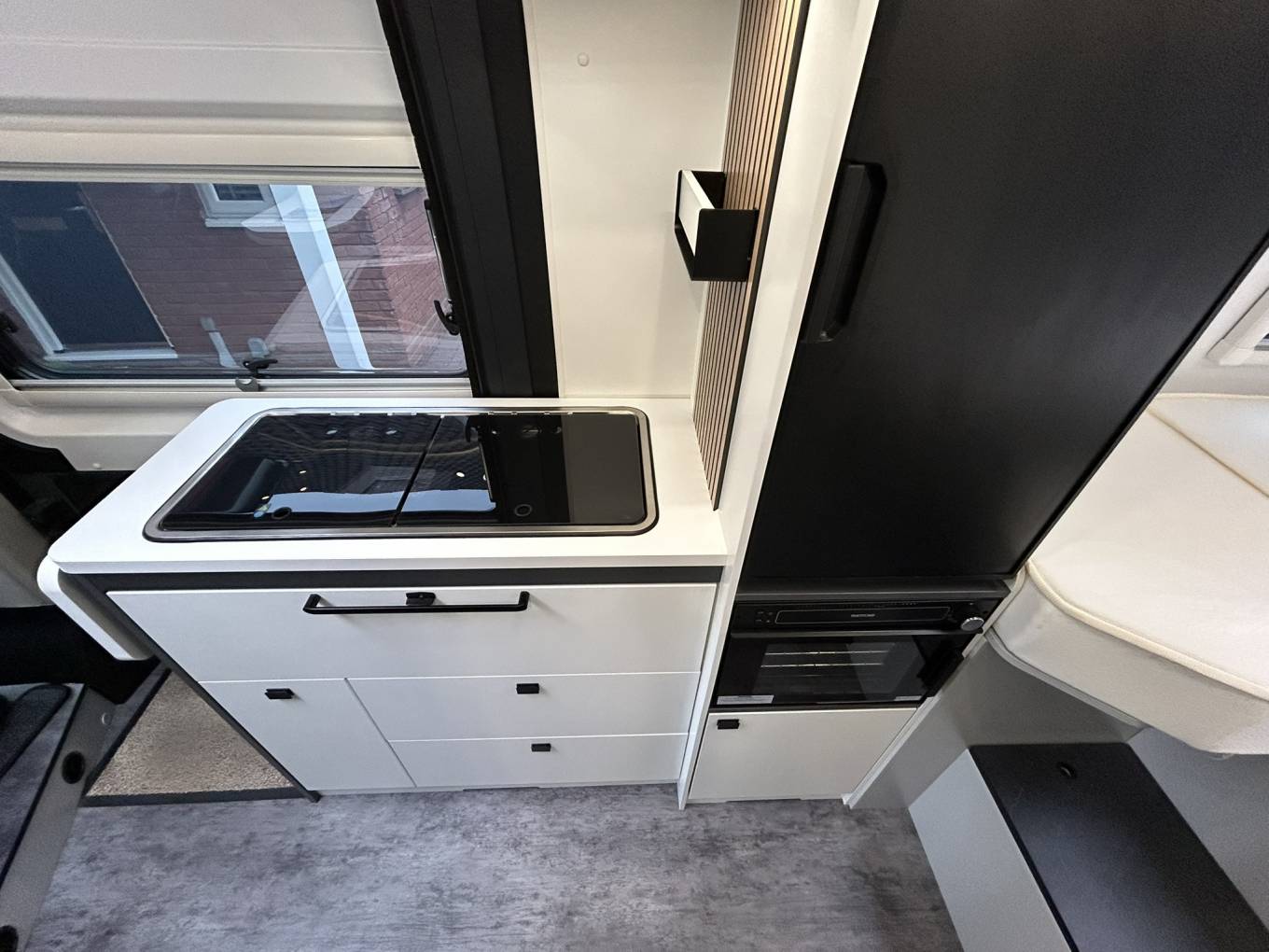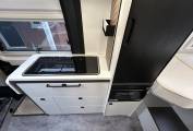 The living area is thoughtfully designed, with a modern kitchen including a 3-way fridge freezer, a gas hob and sink. The Truma heating and boiler system ensures reliable warmth and hot water, while the external shower point adds flexibility for outdoor use.