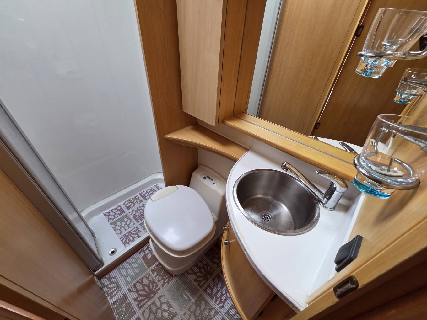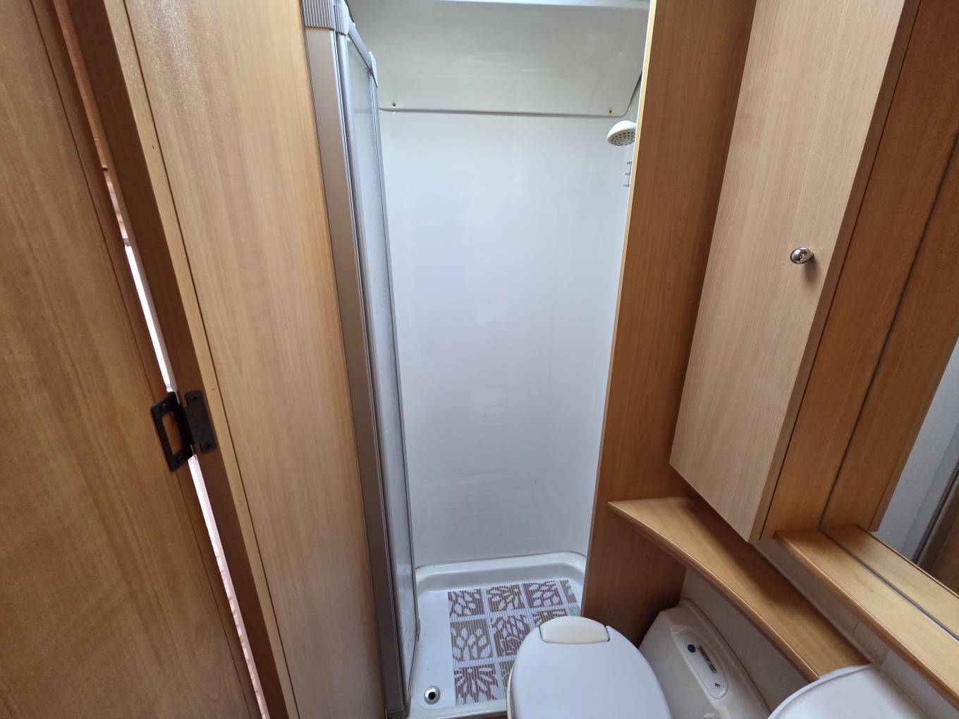 The van has a very popular layout having the rear fixed double French bed with generous storage underneath. The comfortable dinette is equipped with an extending dining table and can accommodate up to 6 guests with the 2 swivelling front seats making a great social area and easily converts to a double bed if required to provide further sleeping for 2 . Along side the bed is a spacious washroom which is equipped with a separate shower area,sink and toilet and the kitchen comes complete with a fridge with freezer compartment, a 3 burner hob and sink.