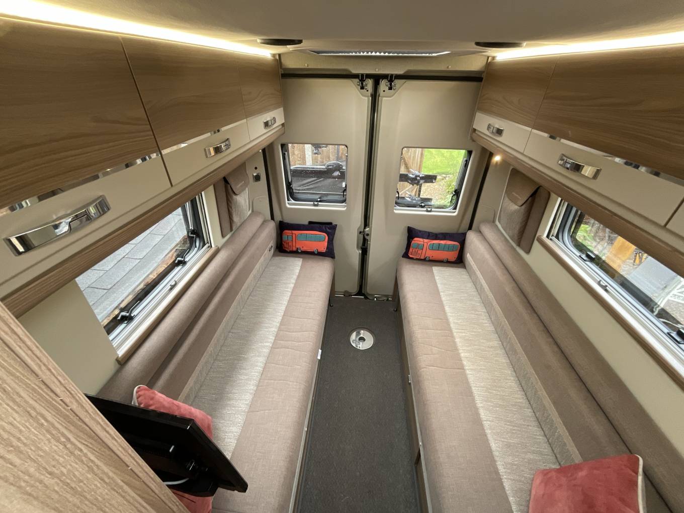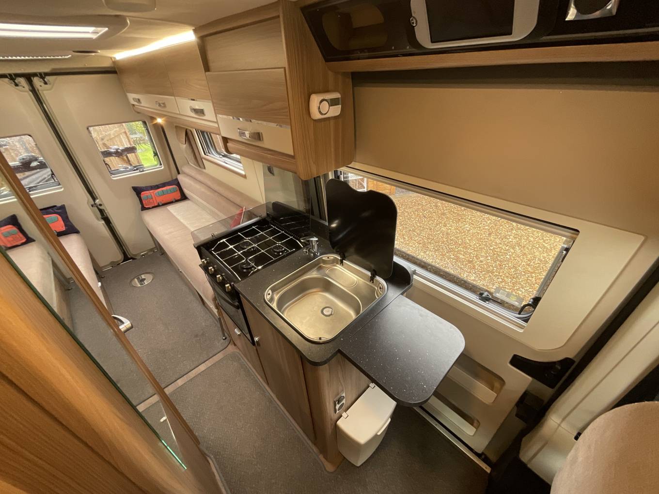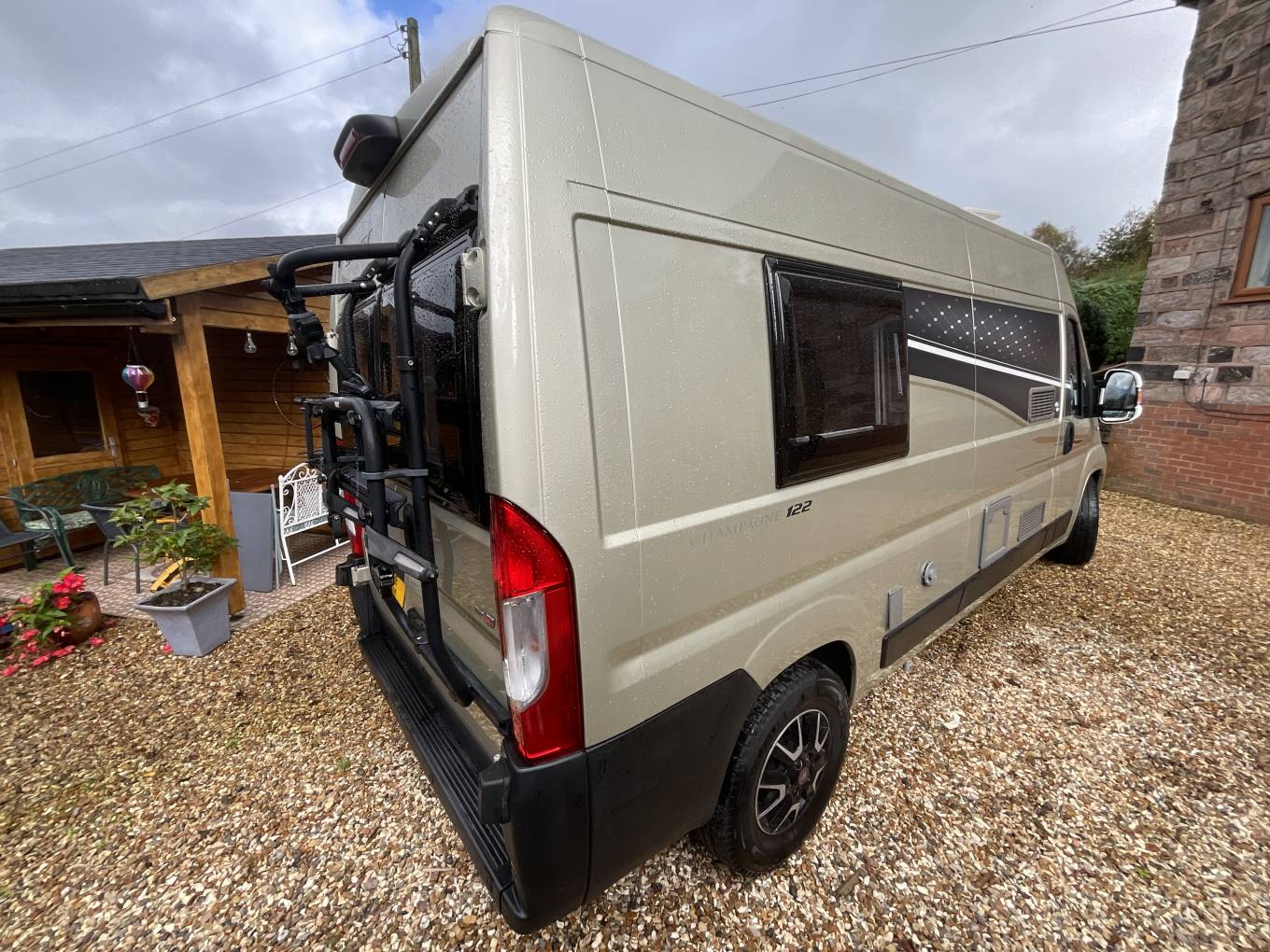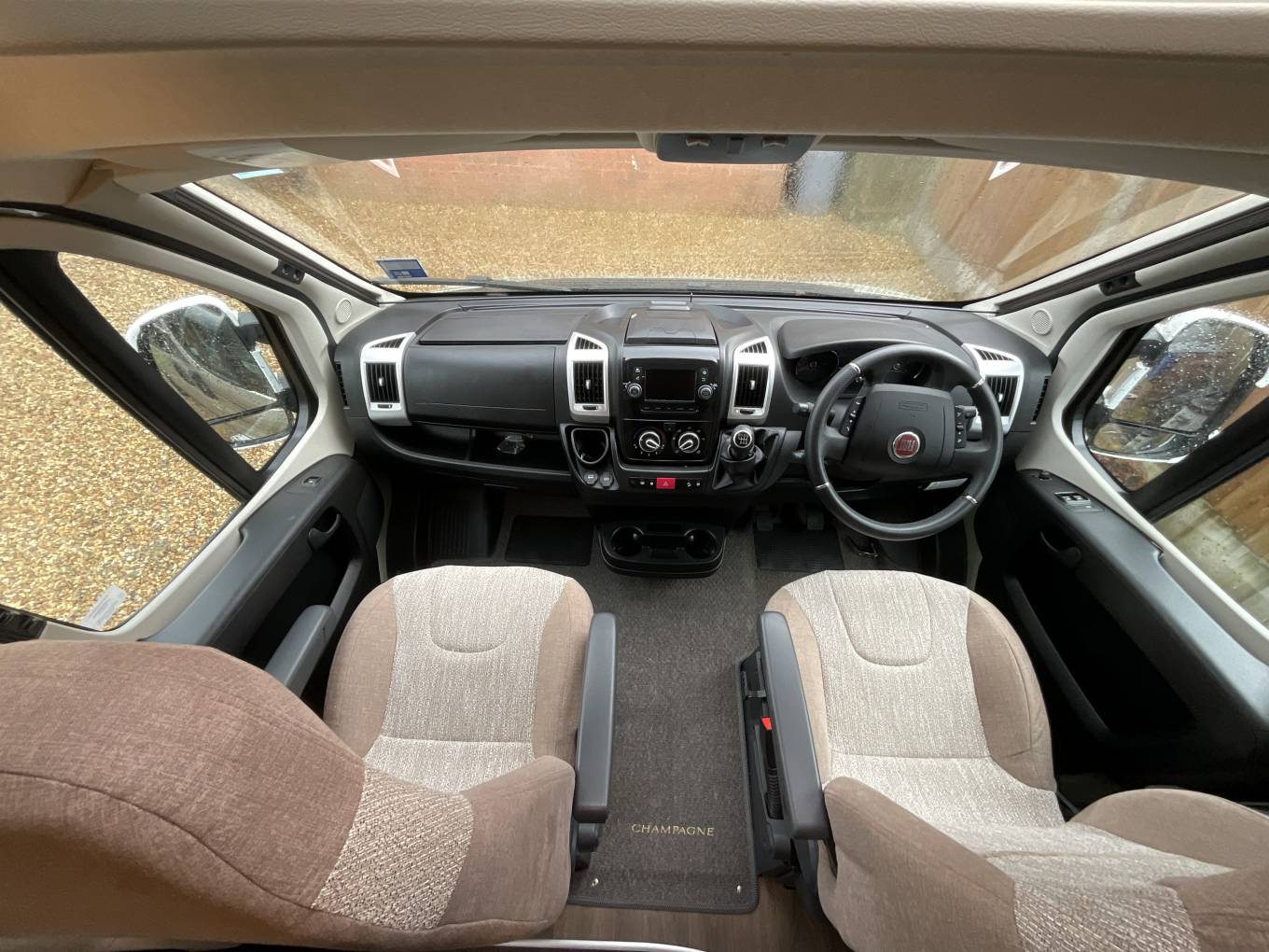 The cab benefits from air conditioning, cruise control, and swivel seats for added comfort, while features such as a reversing camera and optional extras like an awning or bike rack make life on the move even easier. The Champagne edition’s elegant exterior finish gives this motorhome a touch of class that truly stands out.