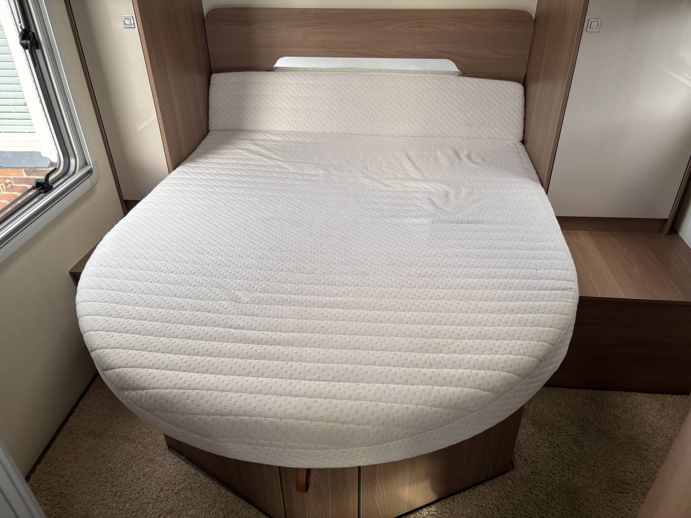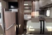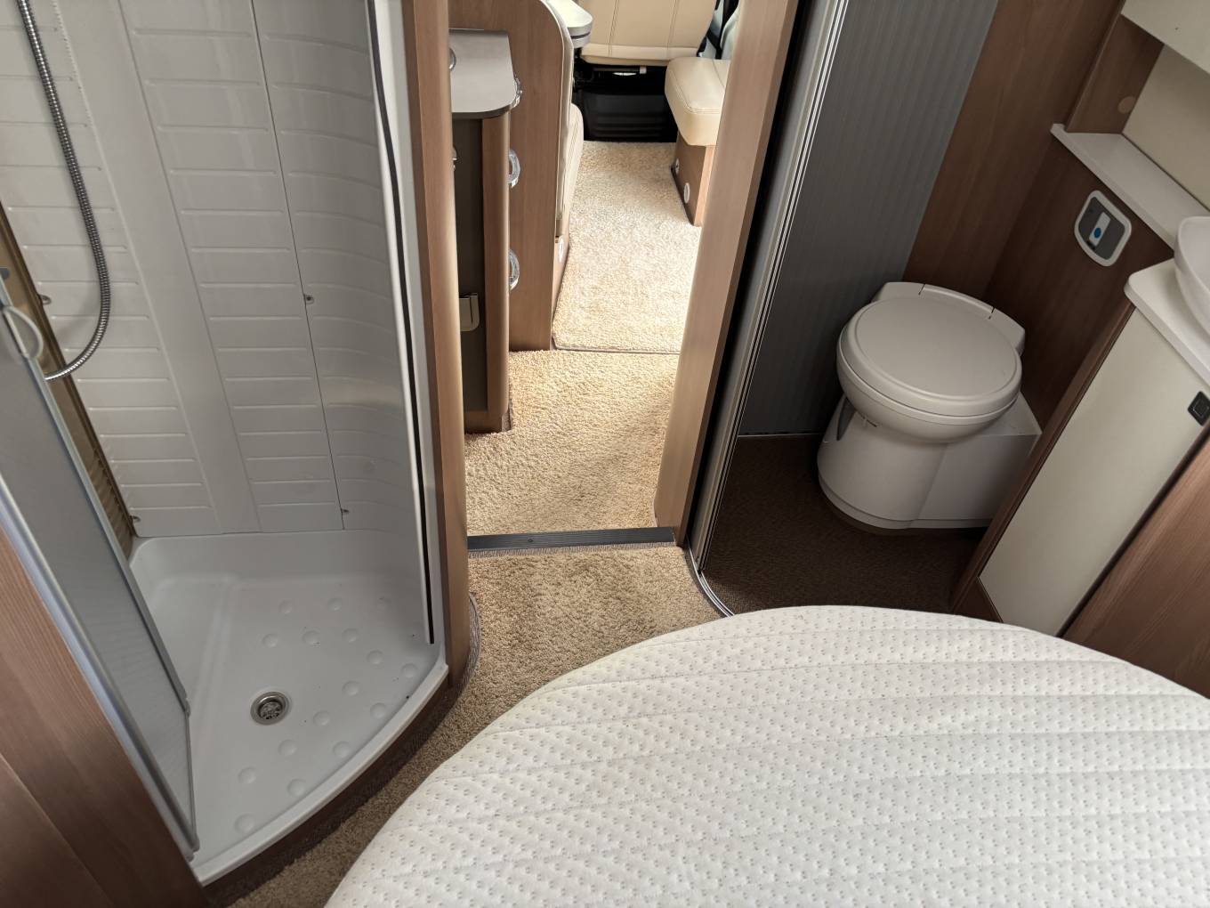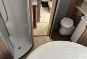 Inside, the layout has been designed with comfort in mind. At the rear, there’s a fixed island double bed in its own private bedroom area, complete with a sliding door for separation. The washroom facilities are conveniently split, with the toilet and sink in one cubicle and a separate shower cubicle opposite, creating a spacious en-suite feel.