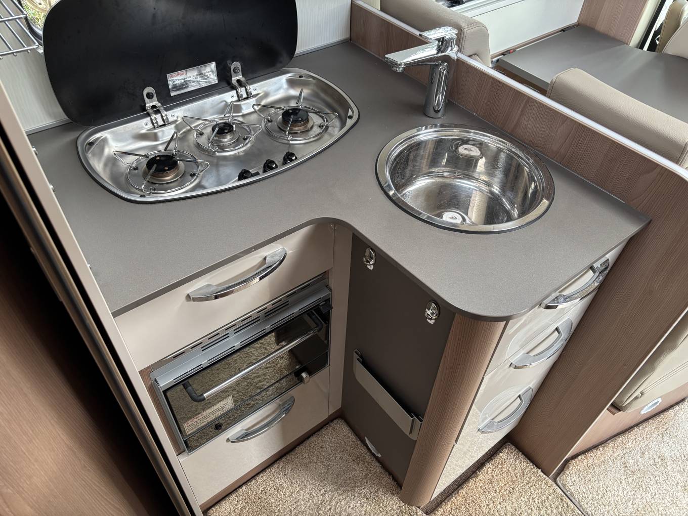 The kitchen area is well equipped with a sink, oven, three gas hobs, and a large fridge with freezer compartment, while the front dinette provides a comfortable place to dine and relax. Storage is plentiful, with a wardrobe, numerous cupboards, and overhead lockers throughout, plus a large garage with external access from both sides for added practicality.