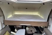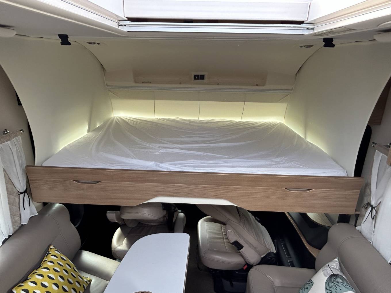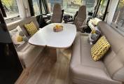 Inside, the spacious front lounge creates an inviting area to relax and entertain. Two large side-facing sofas and the swivelling front cab seats allow up to six people to gather comfortably around the multidirectional dining table — perfect for meals, games, or evening drinks. The interior exudes sophistication and comfort, with high-quality materials and thoughtful touches throughout. When it’s time to unwind, a drop-down double bed above the cab provides a luxurious and convenient sleeping space. There are also two additional travel seats with seatbelts cleverly hidden beneath the sofas, combining practicality with smart design.