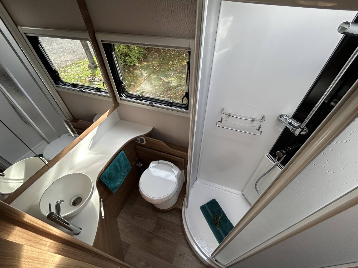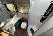 The rear kitchen is beautifully equipped and designed for effortless meal preparation on the road. It includes a dual-fuel hob, oven and grill, microwave, and a large automatic-selection fridge freezer — everything needed to enjoy home-cooked meals wherever your journey takes you. The spacious bathroom continues the luxury theme, featuring a separate shower cubicle along with modern toilet and washbasin facilities, ensuring comfort and convenience at all times.