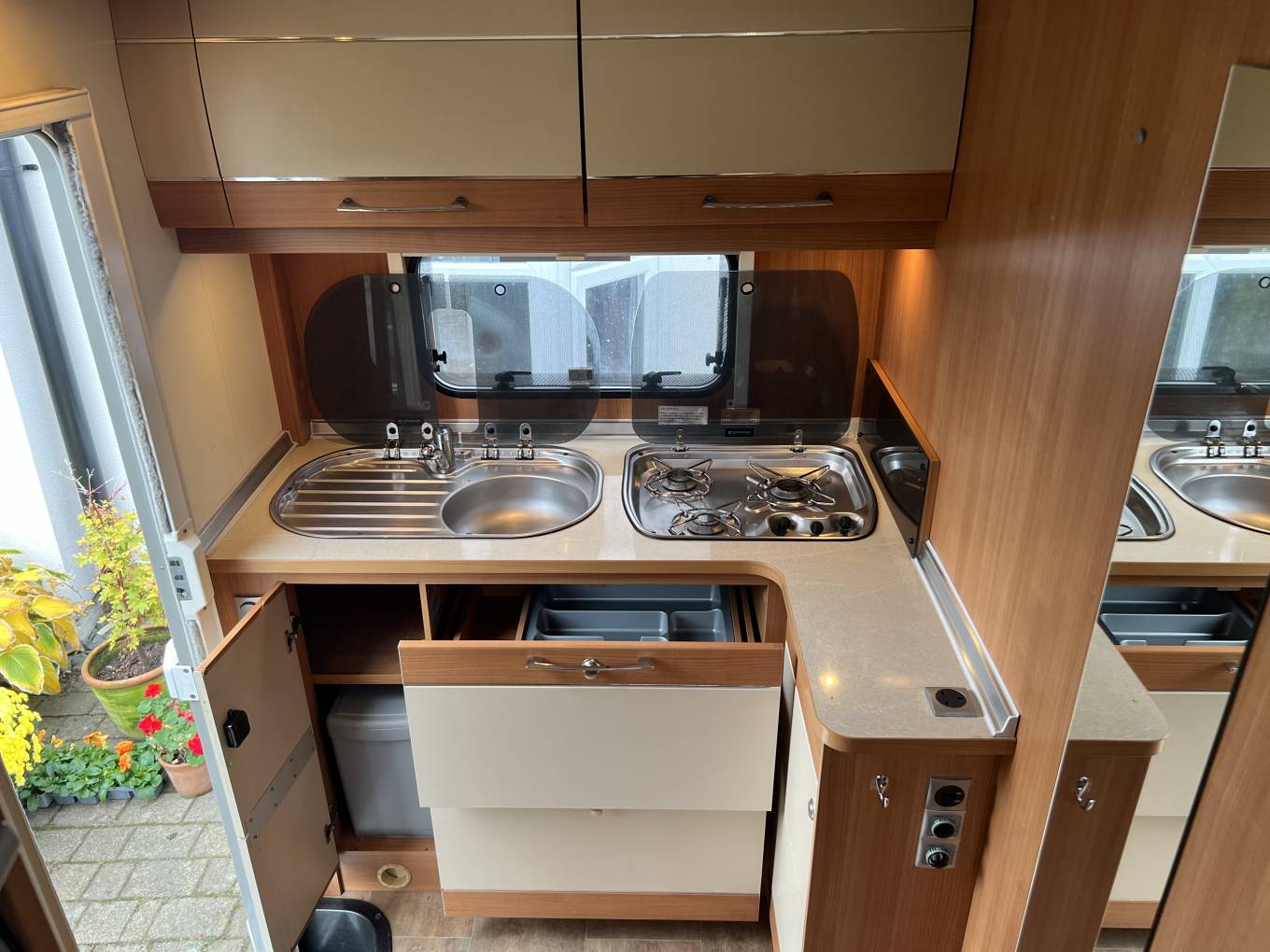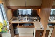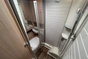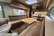 Briefly, there full width storage under the kitchen and washroom at the rear, L shape sofa and opposite a long sofa in the lounge area, 2 swivel seats and a large drop down bed above. There dinette can convert to an occasional bed, so more suitable for 2 people travelling.