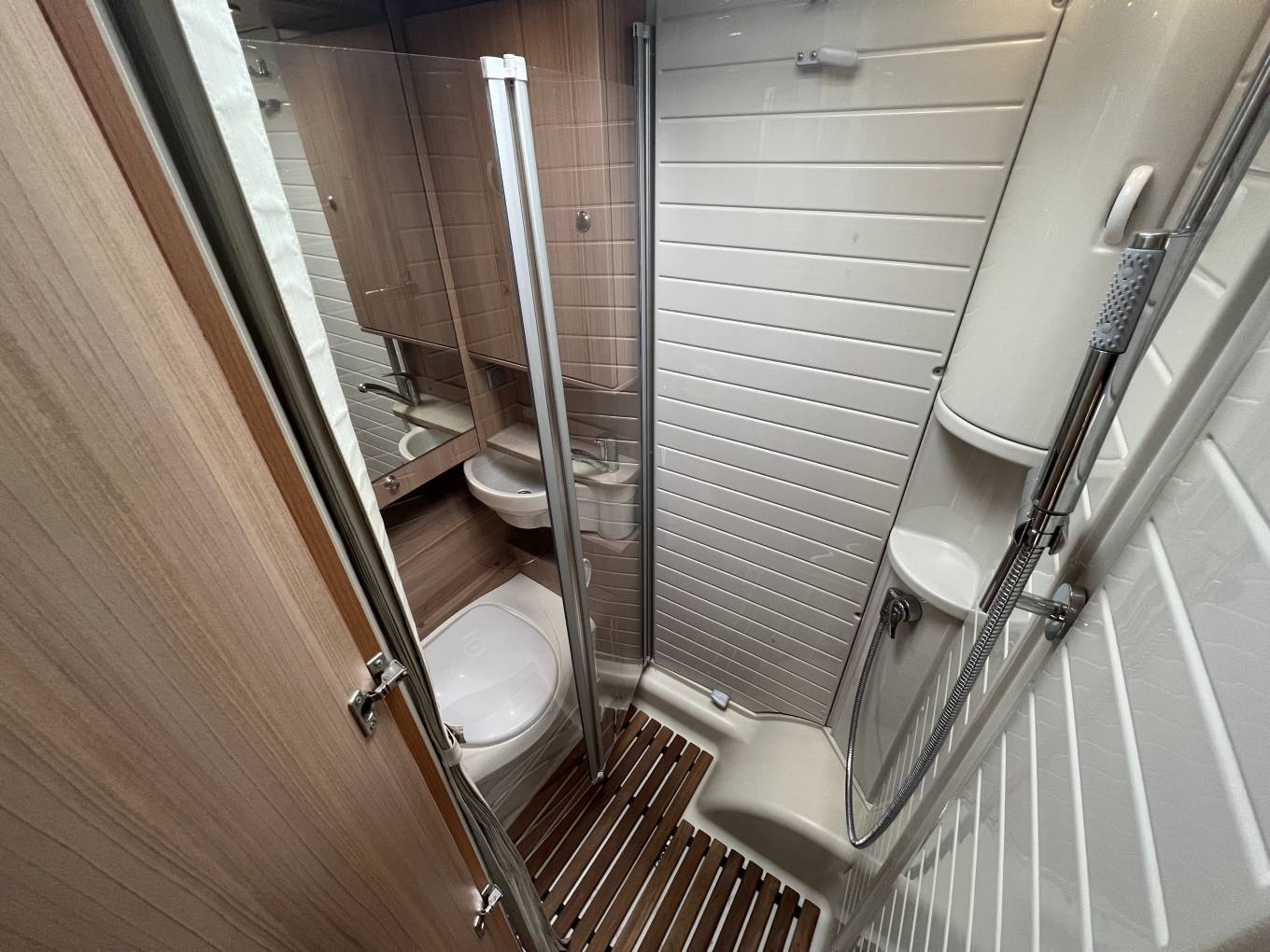 The rear washroom has toilet, sink and shower with bi-folding enclosure.
