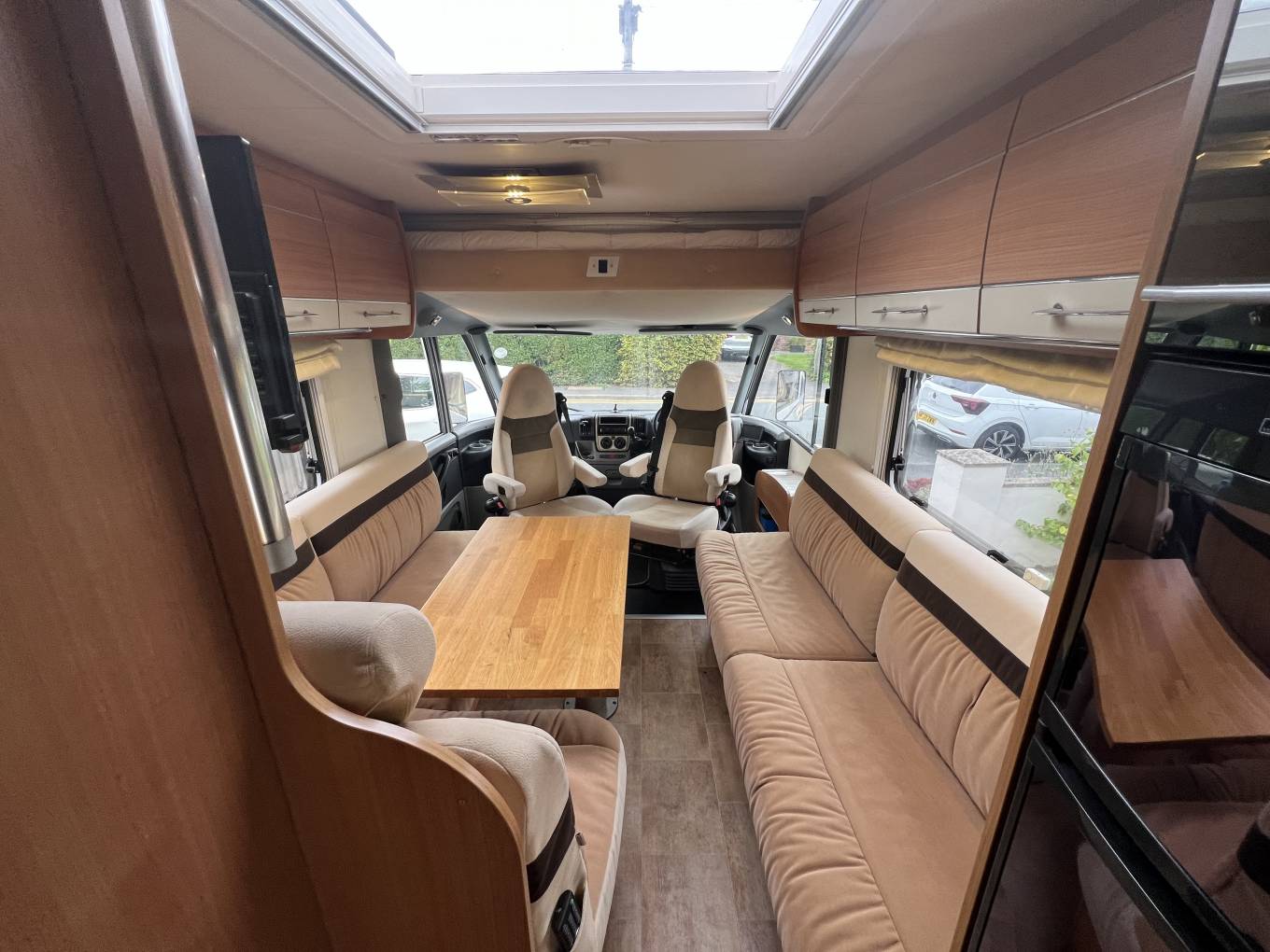 In the front lounge are 2 sofas. On the off-side is an L shape sofa, with 2 travelling seatbelts, which can be used as an occasional bed. Opposite, is a long sofa, which can be used as an occasional single bed. There is a TV here.