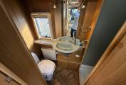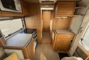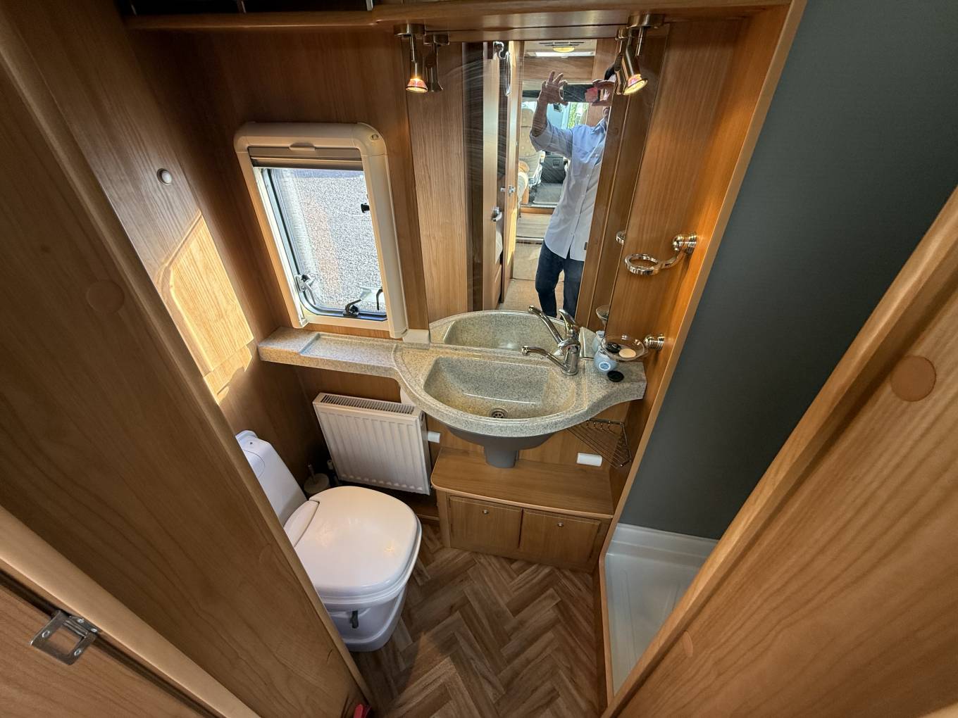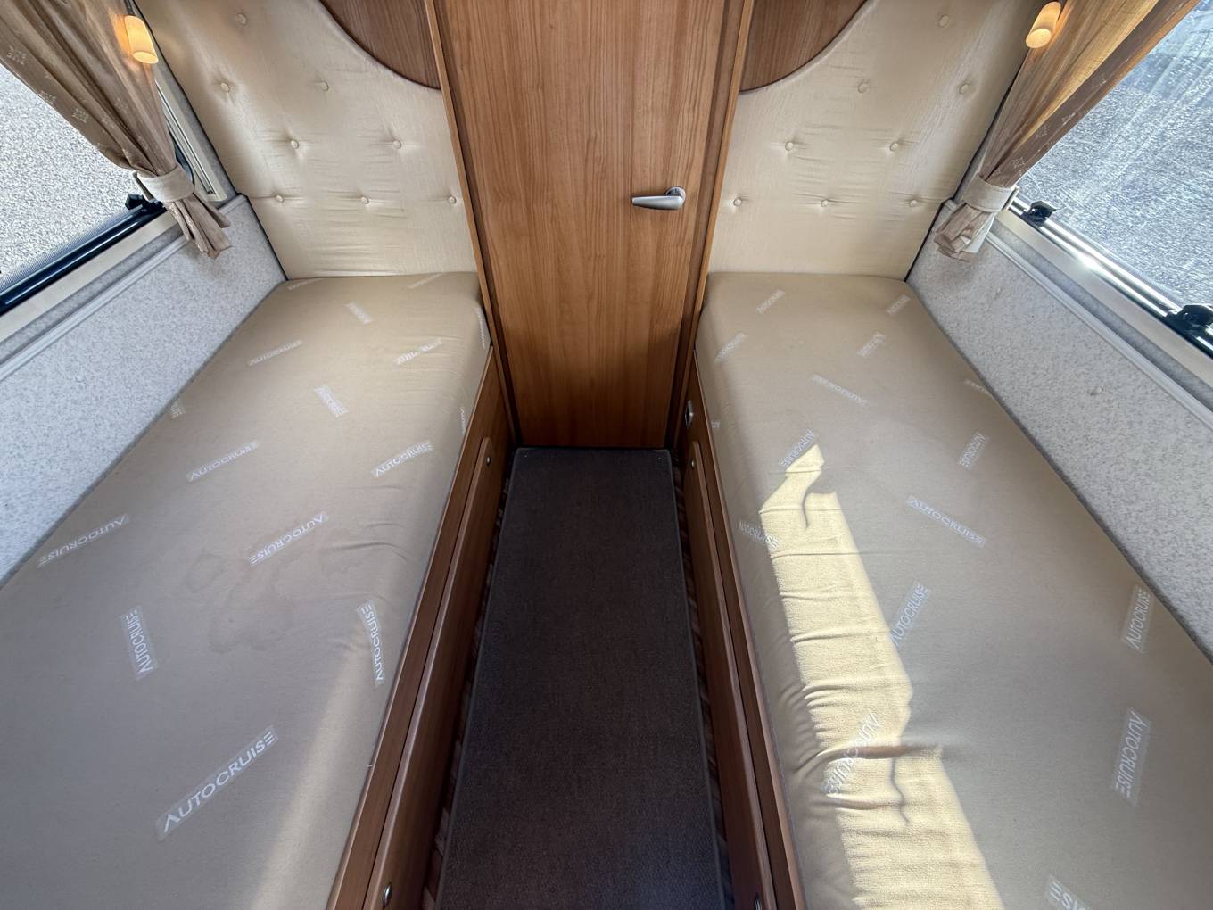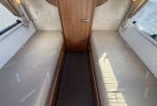The main feature is the mid ship bedroom with twin fixed single beds, which both raise to reveal extra storage space, two wardrobes with concertina doors and upper aircraft style storage lockers. The rear ensuite washroom has a large separate shower cubicle with perspex shower doors, a built-in wash basin with chrome mixer tap and a Thetford cassette swivelling toilet with electric flush.
