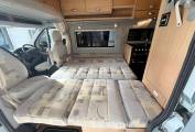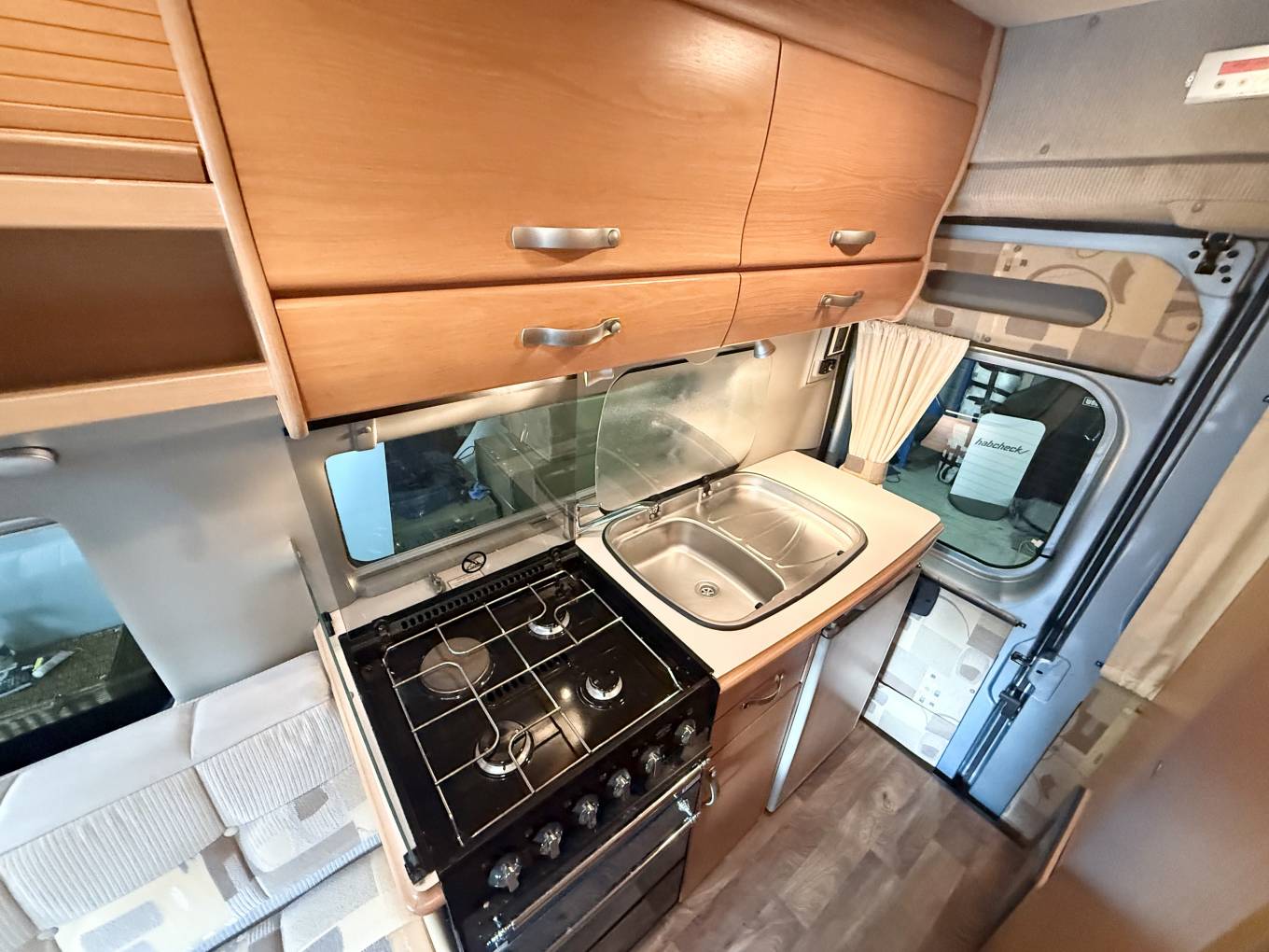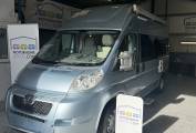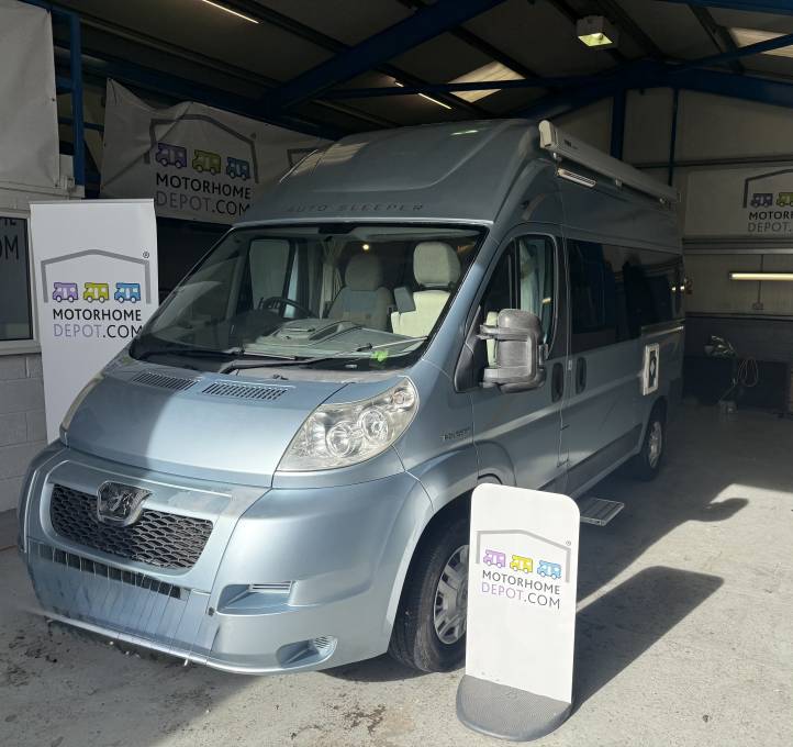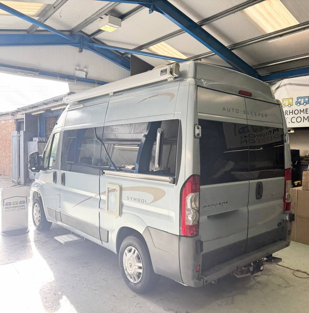 2009 Auto-Sleeper Symbol Motorhome Peugeot Boxer, 2.2l 120Hp 6-speed Manual – 2 berth, Absolutely lovely clean motorhome, perfect for couples looking to get away in their own isolation. Open the side sliding door and pop out the electric step to enter, where you find the lounge and dining area, you have a side sofa and a forward facing seat with three-point seatbelt, this area converts into either two single beds or can be made into a large double bed in the evening. Large windows and a sunroof flood the lounge with plenty of natural daylight making it light and airy, with upper storage lockers and under-seat storage.
