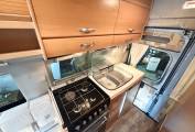 The kitchen has a stainless steel sink with draining board, chrome mixer tap and glass lid, hob with three gas burners and an electric hot plate, gas grill and oven beneath, a three-way fridge and plenty of cabinets and cupboards for storage.