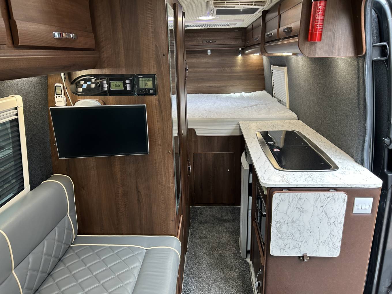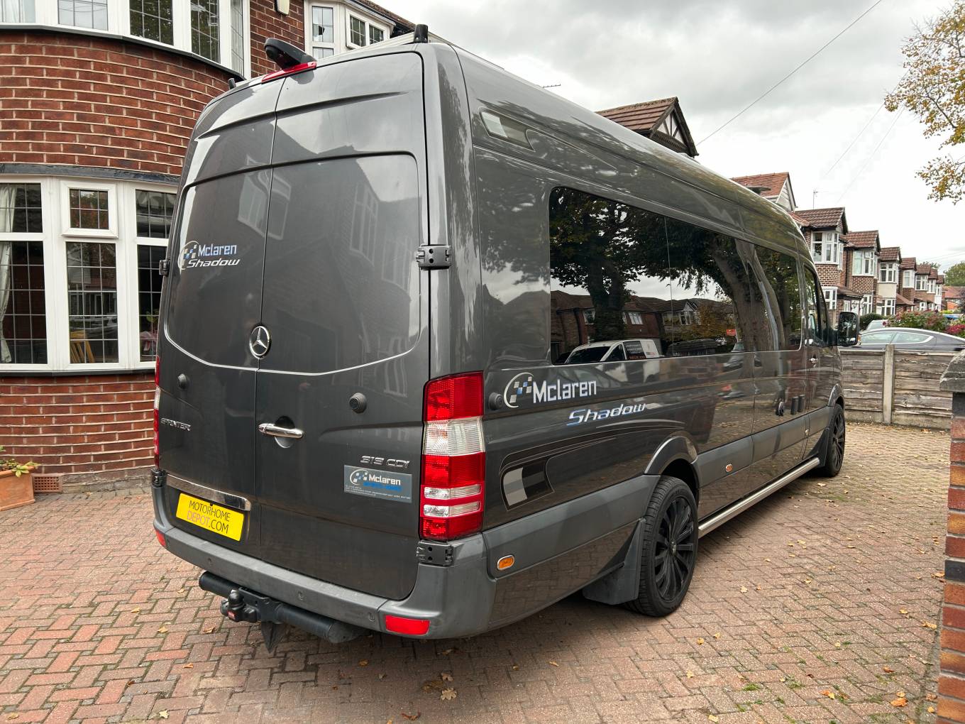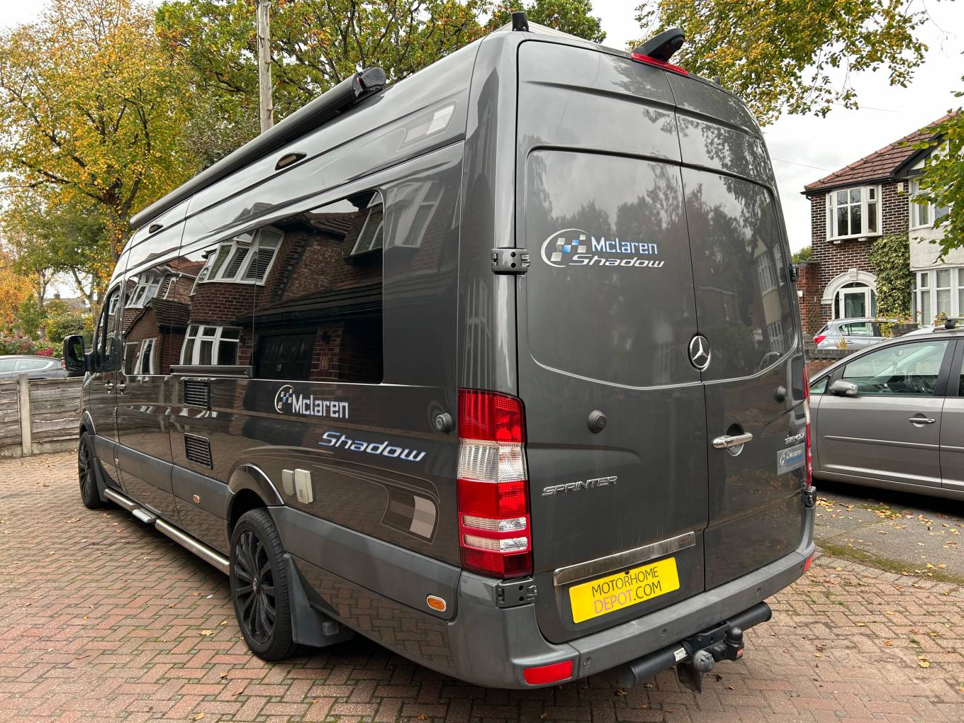 Finished to the highest quality we have this Mclaren Shadow Sport 2 berth 2018 Mercedes Sprinter camper with 17,200 miles length 7.5m. It has Air Suspension, E & P Hydraulic self levelling, a solar panel with 2 leisure batteries, a dash cam and a reversing camera. As you enter through the side door, to your right we have the kitchen area that has all you need, 2 gas rings, sink with glass lid, fridge with freezer compartment, a small oven /grill, plenty of storage and a good size worktop. Directly opposite there is a very nice modern washroom with toilet and shower with fold down sink. Moving to the back there is a stunning very large double bed with storage underneath. This area also has a wall mounted television. Both front seats swivel around and there is a removable dining table. Other features include Airconditioning in both the cab area and the habitation area, refillable gas tank, wind out awning. All of the habitation windows have blackout blinds on them and also has a sky light at each end of the camper making it light and airy. It has alloy wheels and a large rear garage with extractor fan ideal for storage. For those sunny days there is a fixed awning canopy.