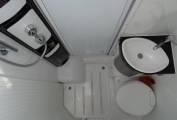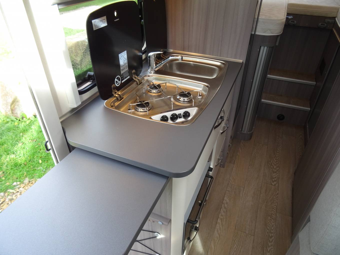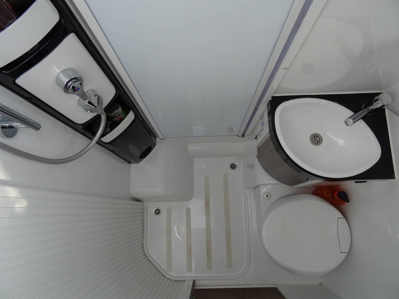 The central kitchen area enjoys a fridge freezer, 3 gas burner stove with an oven below which is integrated into the worktop space. In the centre of the motorhome there is a good-sized washroom which features a shower, toilet and sink with storage cabinets above.