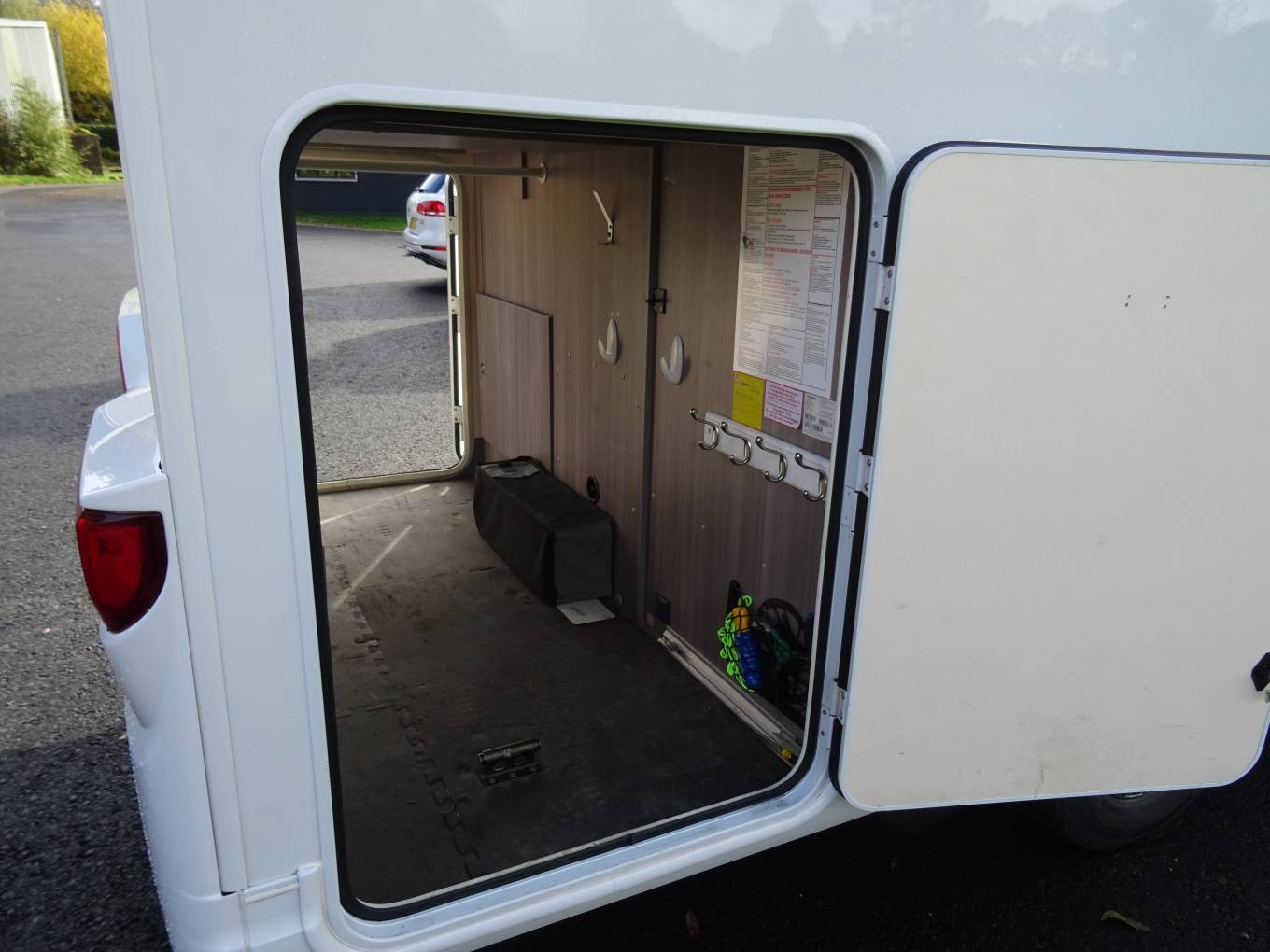 Some stand out features are the rear sports garage which is excellent for those wanting to take larger items on their adventures. Fully equipped to go off grid with 2 x solar panels, 2 x 180w Lithium Batteries and a 3000w invertor. It has plenty of other storage inside, below the rear fixed bed and multiple cabinets all around the motorhome. It also has a Multimedia Centre including Sat Nav, Bluetooth and reversing camera.