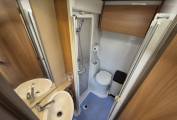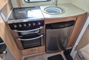 Moving up there is a spacious lounge area which is complimented by twin swivel chairs, with the table in place this all makes for a very comfortable lounge/diner and can easily seat 6 people then at night can be utilized as a transverse double bed or you can have 2 singles if preferred. Heating and hot water are supplied by the new Truma on gas and electric and there is also a new diesel night heater if preferred. There are blinds and fly screens throughout including the Hab door and curtains in the lounge and skylights. . Storage is no problem with the 600EK model which includes high level lockers, a large wardrobe with shelves and under seat storage that can also be accessed outside for convenience.