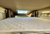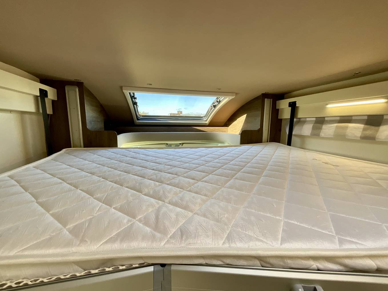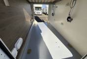The front lounge can comfortably seat five around an adjustable table, and plenty of light is let in through the large skylight above. At night, a second bed can be dropped down at the press of a button, making this a four berth.