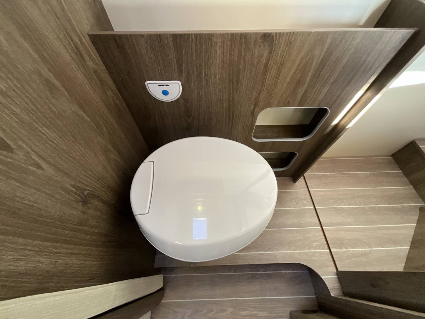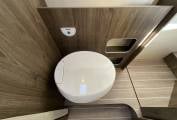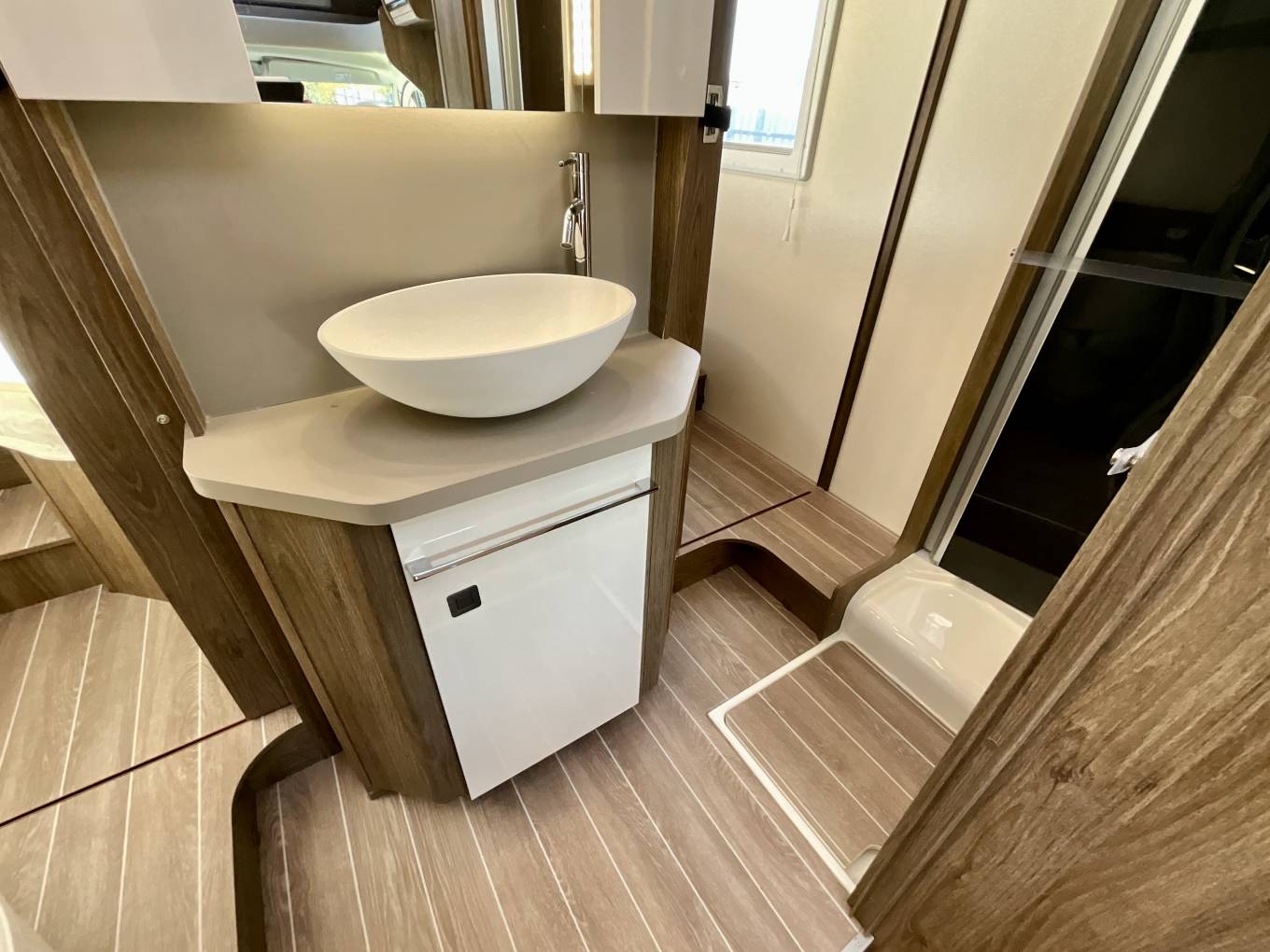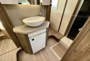 Behind the galley is the washroom, which features partition doors to allow privacy. There is a separate shower cubicle, Thetford toilet with cassette, washbasin, and vanity unit with LED lighting and storage cupboards.