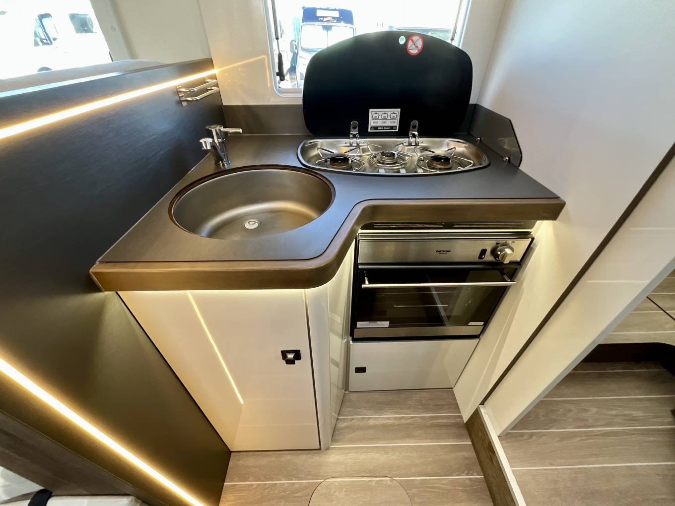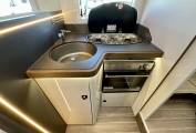 The galley is equipped with gas hobs, sink, Thetford fridge/freezer, Thetford oven/grill and plenty of storage throughout.