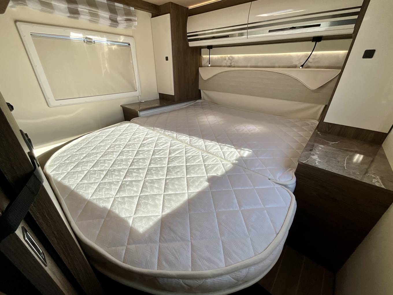 To the rear, the height adjustable fixed king sized double bed provides plenty of room, and features underbed storage. To the sides, large wardrobes allow for hanging clothes and overhead lockers.