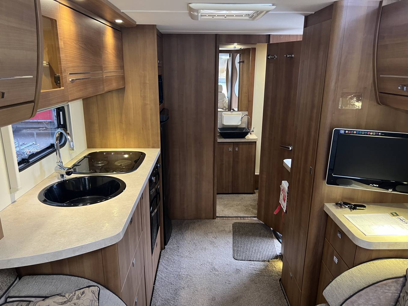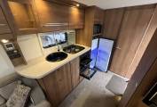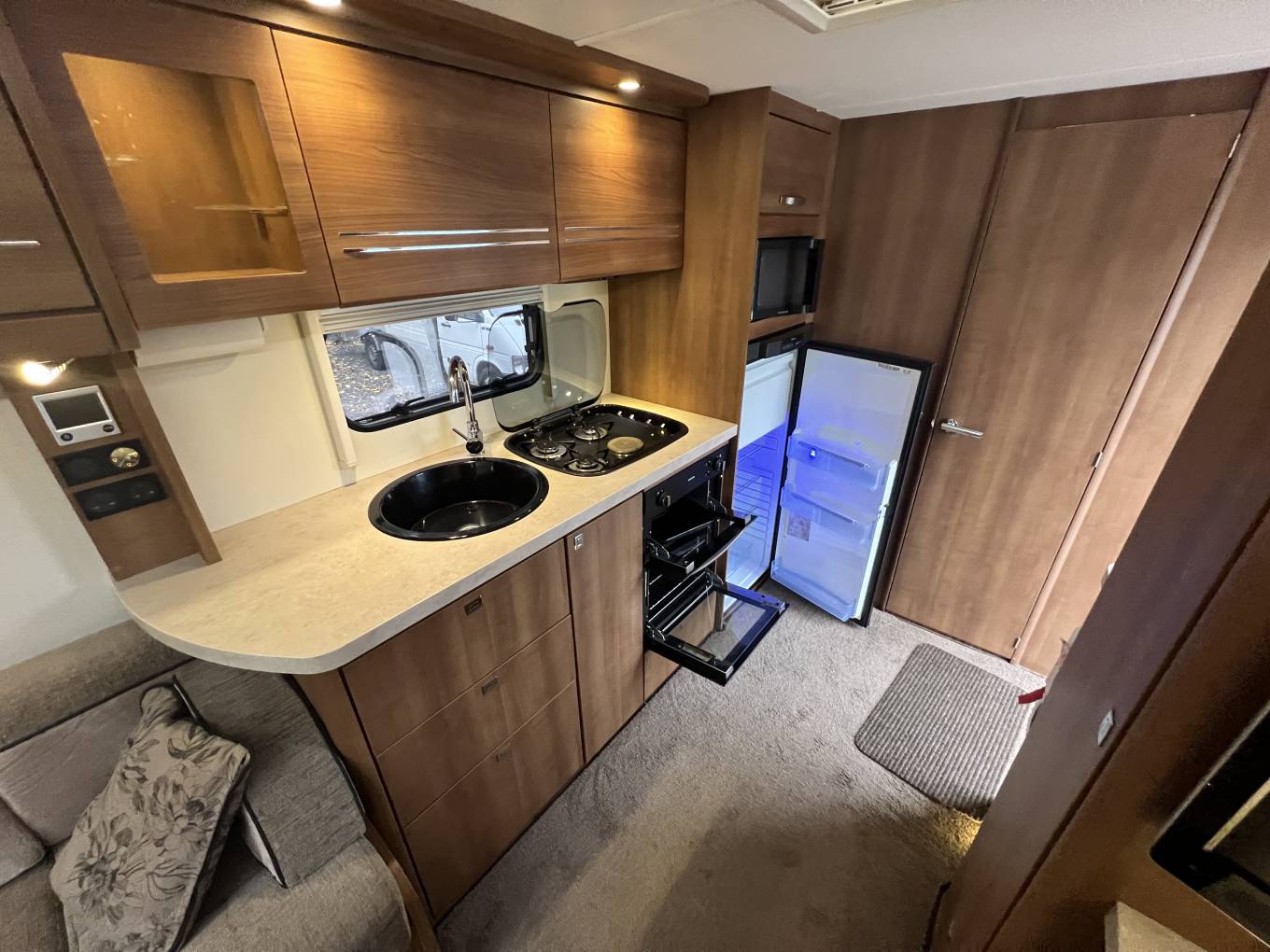 The side kitchen comes equipped with everything you need for a touring holiday, incl tall fridge freezer, sink, microwave, extractor and cooker with electric hob, 3 gas burners, oven, and grill.