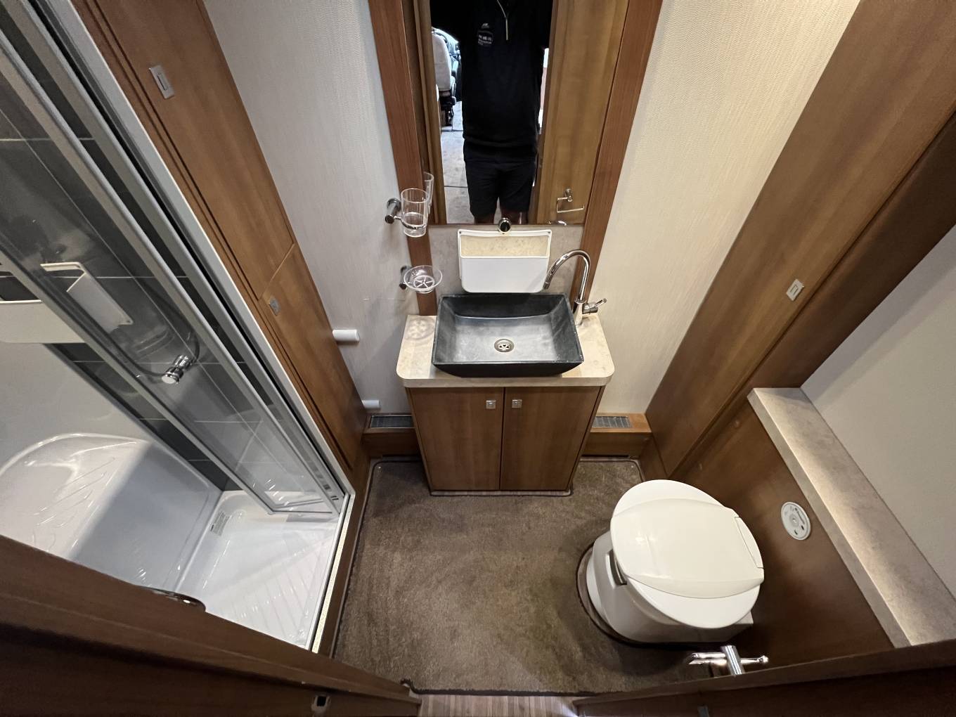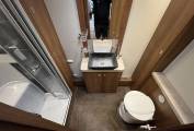 At the rear is the washroom which covers the whole width, with toilet, sink and shower with full enclosure. There is plenty of storage in here.