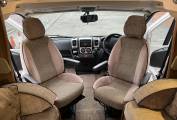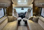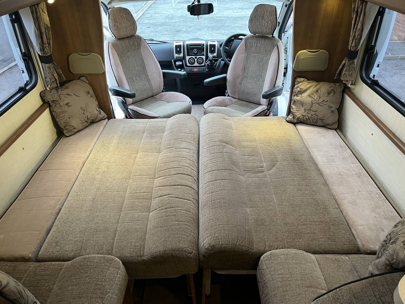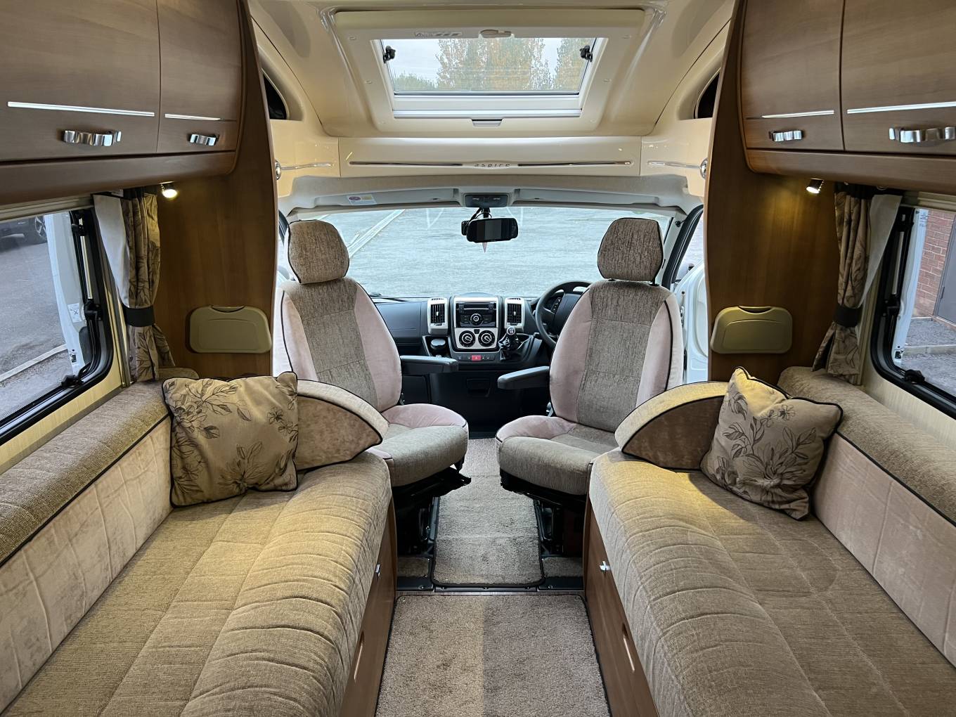 The basic layout is large rear washroom, kitchen opposite the habitation door, 2 long sofas, that also are used for sleeping and 2 captains’ seats upfront.