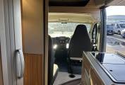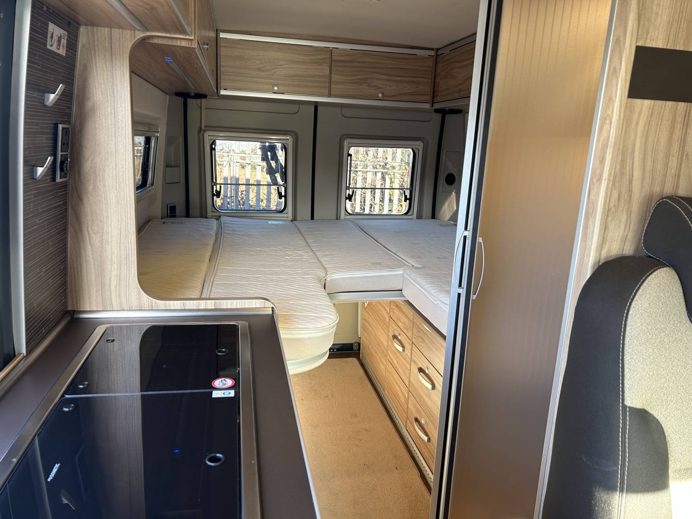 Inside, the layout features the option of 2 single beds, one measuring 6ft, and the other measuring 6.5ft, plus the option of full fixed 6ft-wide double — offering excellent comfort and flexibility for couples or families. The fold-out dinette and swivel cab seats create a spacious and welcoming living area, while the well-equipped kitchen includes a Fridge, grill, hob, and sink for easy on-the-road meals.