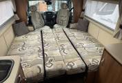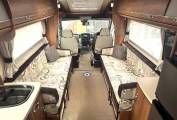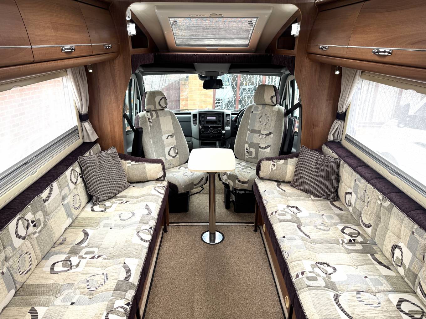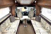As we head towards the front of the motorhome, there is the incredibly spacious central dinette which is flooded with light natural light making it a fabulous spot to relax and unwind in. There are long side benches on either side and along with a swivelling travel seats you have plenty of seating options, especially if you have guests. there is also a coffee table that is positioned between the travel seats and a large dining table that is stored next to the fridge These benches can either be used as singe beds or can conver to make either an extremely large king size bed. There are also numerous over head lockers, storage under the benches and a large over the cab storage space so you are never short of space.