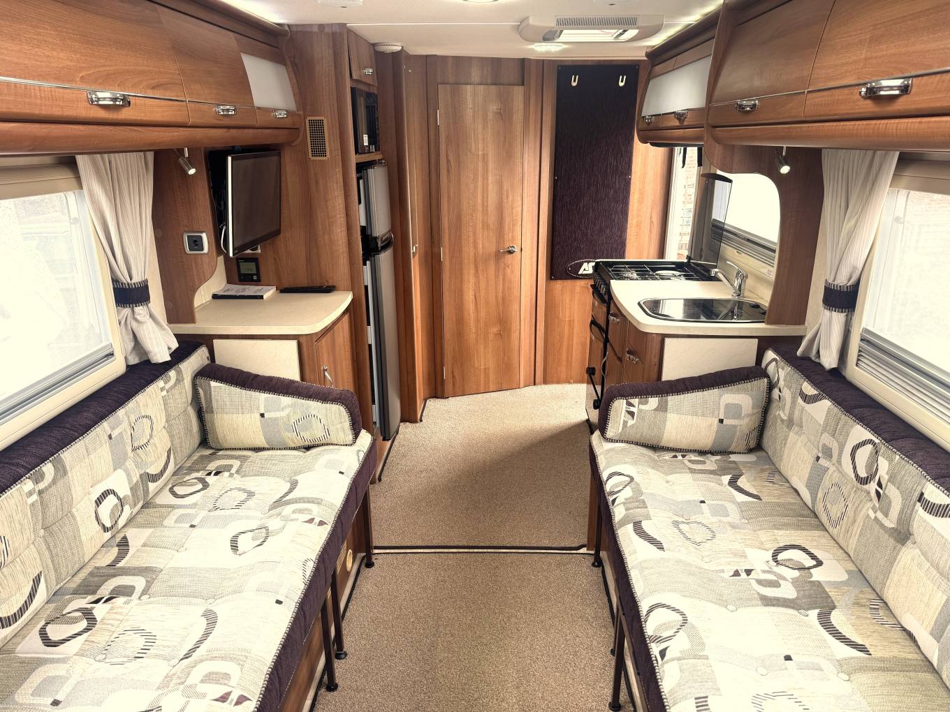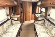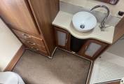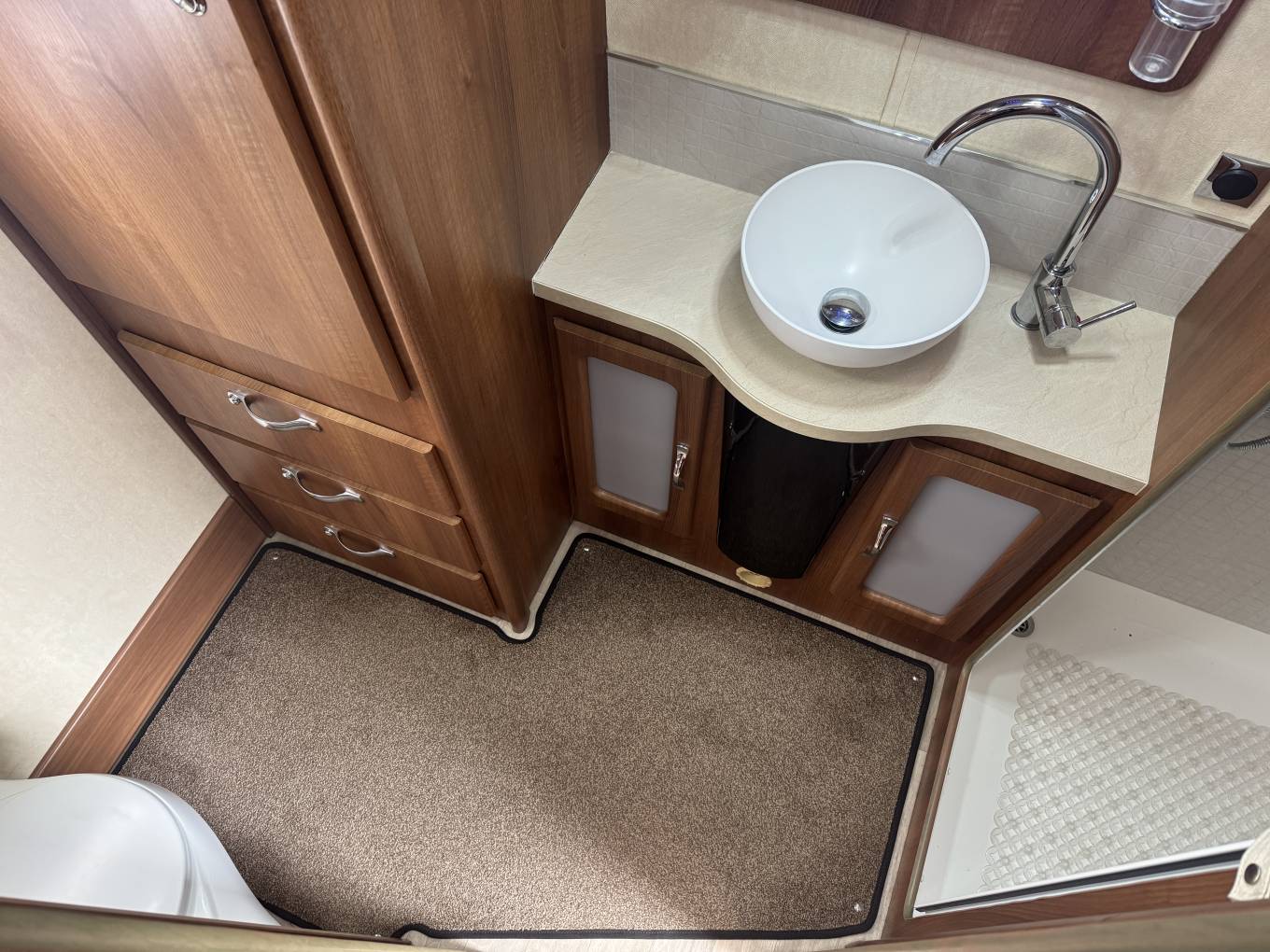 Starting with the rear of the motorhome, you have the highly desirable large washroom which consists of a washbasin with mixer tap, a Thetford toilet and a separate full length shower. The room has plenty of storage which includes a good sized wardrobe along with several drawers and cupboards.