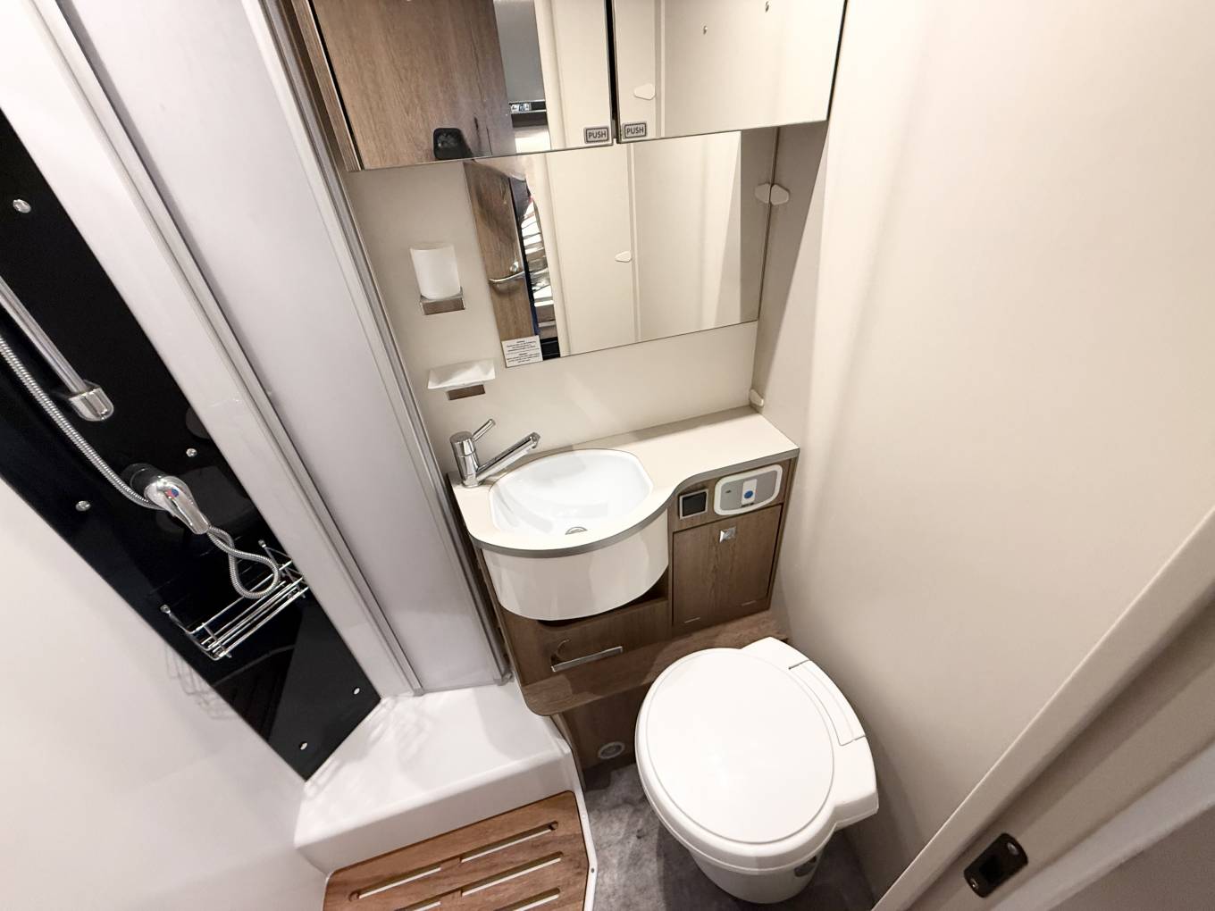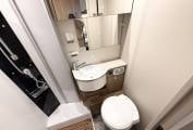 Separate Shower Cubicle for comfort and privacy Toilet and sink basin with additional cupboard storage space and mirror, This motorhome offers an exceptional combination of space, comfort, and features in a sleek, modern package. Whether you’re embarking on long journeys or weekend getaways, this motorhome is fully equipped for every adventure.