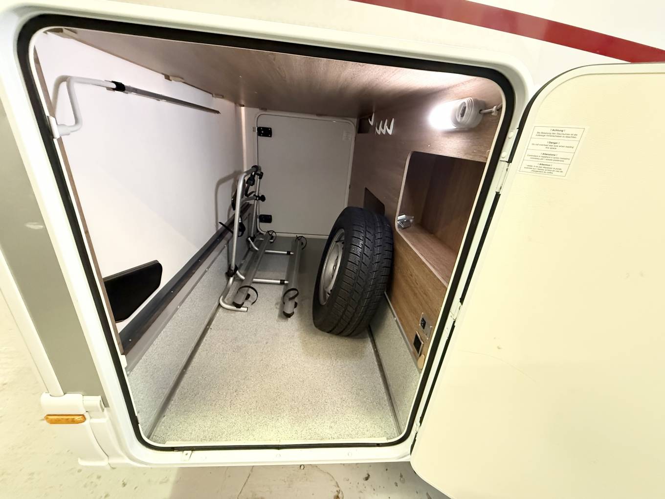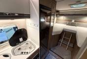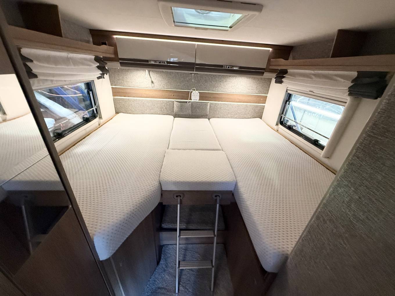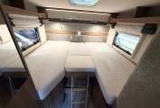 Rear Sleeping Area Twin fixed single beds that can be converted into a large double bed Sport garage beneath the beds, offering generous storage space for bikes, BBQ equipment, chairs, and more. Drop-Down Double Bed: Convenient drop-down double bed located centrally, offering extra sleeping space without taking up room during the day Convertible Living Area: The living/dining area can also be made into a single bed, accommodating additional guests L-Shaped Seating: Spacious L-shaped seating area perfect for relaxing or dining, with plenty of room for socializing Swivel Captain Seats: