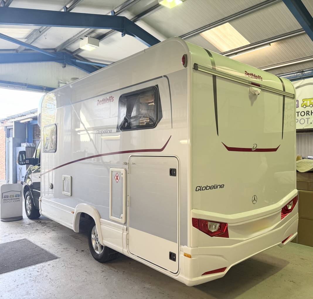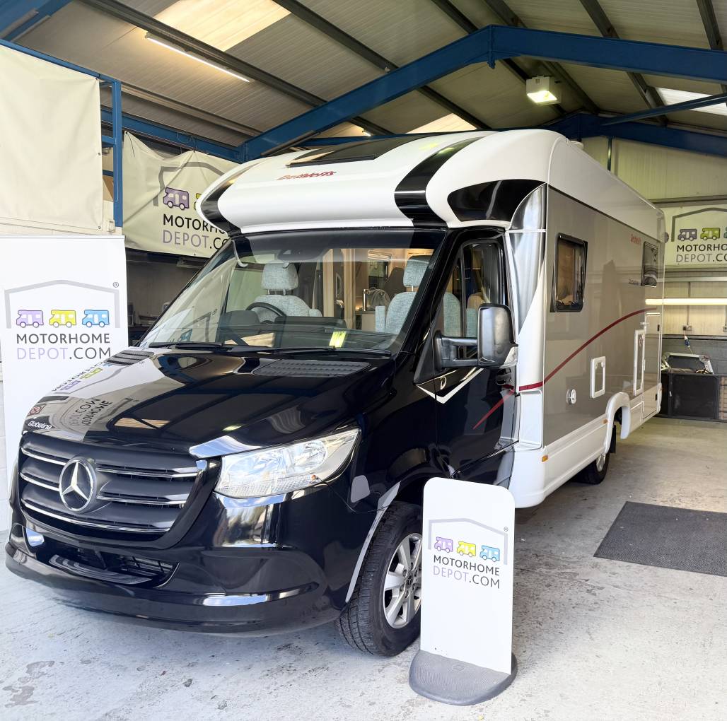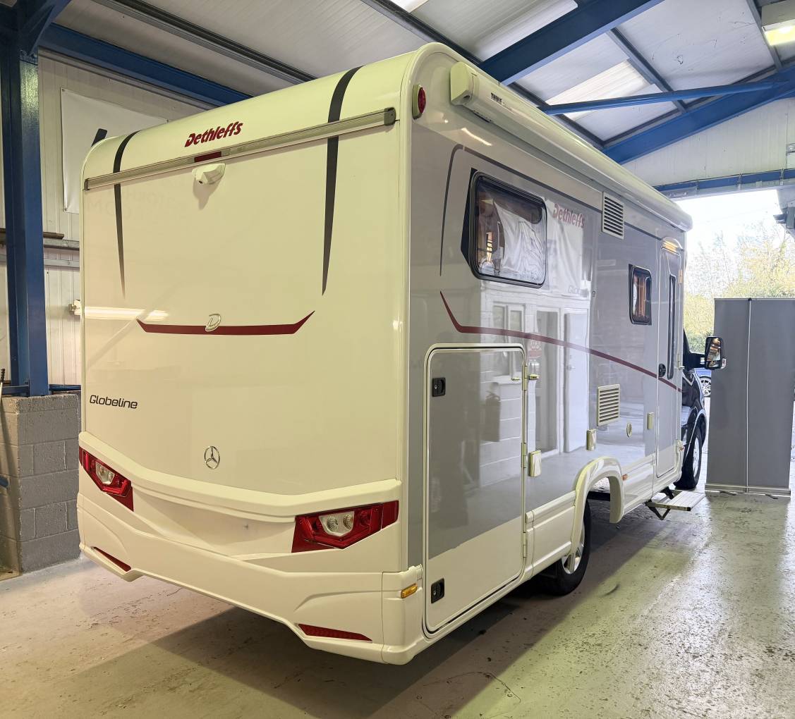 This Dethleffs Globeline 6613 EB motorhome, featuring automatic transmission, Built on a robust Mercedes chassis, this motorhome offers a spacious, well-designed interior with high-end features, making it perfect for families or couples seeking luxury on the road.
