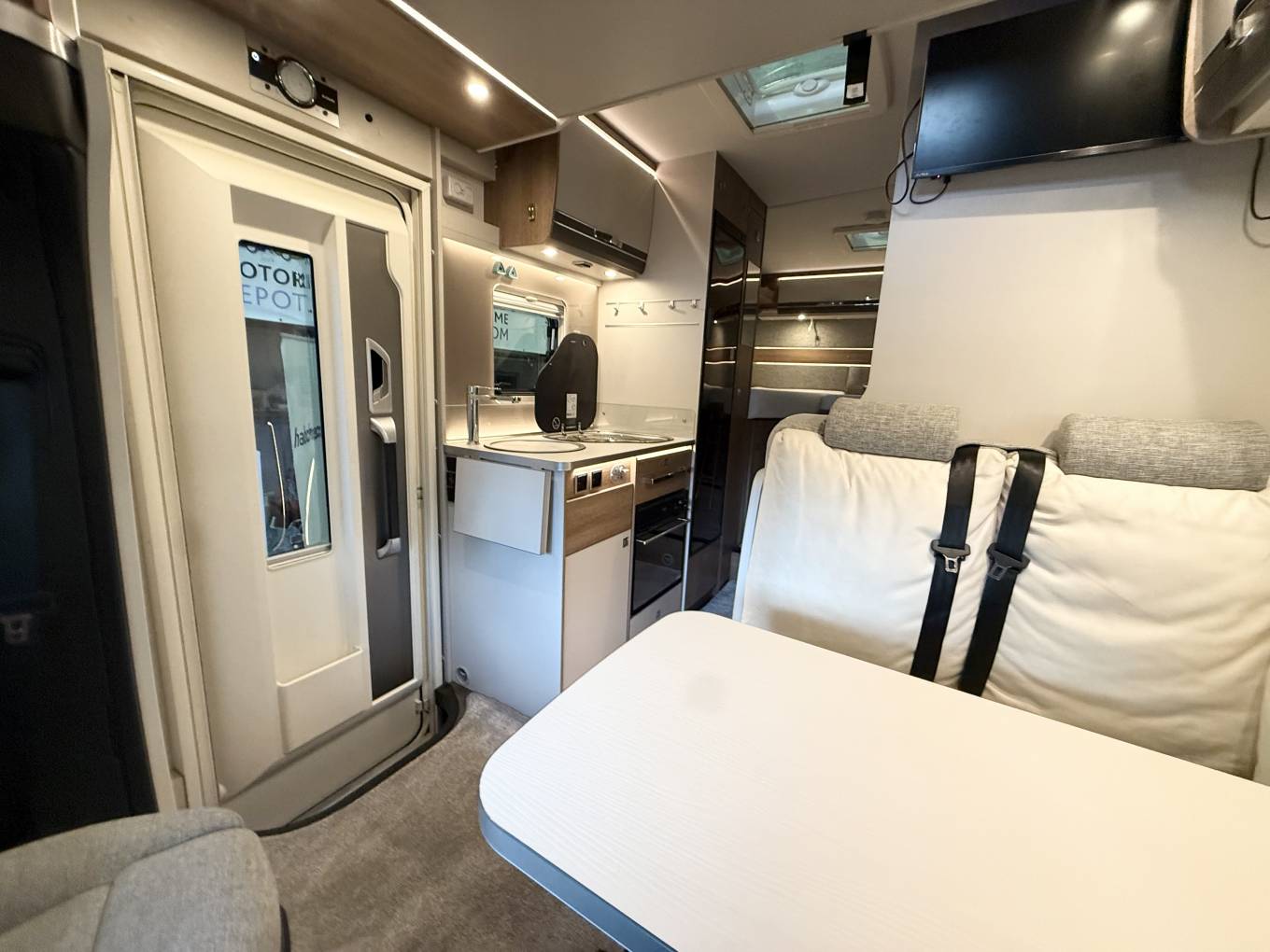 Both front captain seats swivel to provide extra seating around the dining table, enhancing the living area Full-Size 3-Way Fridge Freezer for ample food storage 3-Burner Gas Hob for cooking flexibility Thetford Oven and Grill for home-like meal preparation Sink Basin and Tap with counter space for convenience