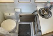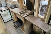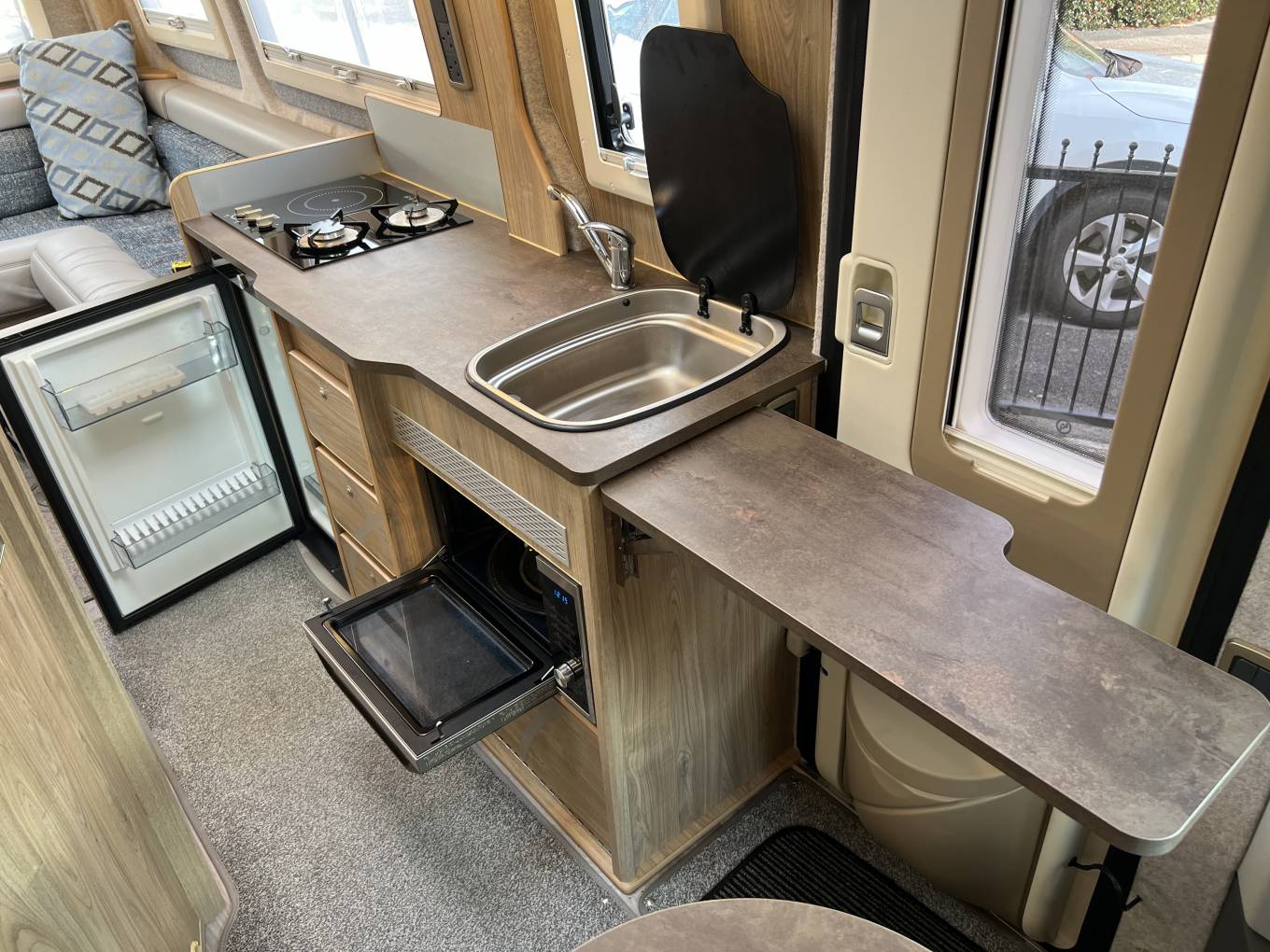 The galley kitchen includes a sink, Samsung combi oven, grill and microwave, hob with 2 gas burners and 1 electric induction ring above, double hinged fridge with freezer and then extensive pop up worktop next to the habitation door.