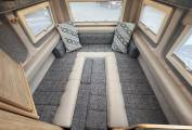 The basic layout is rear boot for storage, with U shape lounge above, which can be used as 2 single beds or a large double, kitchen area, with washroom opposite. Up front both seats swivel. The upholstery is a mix of cloth/ fabric and leather.