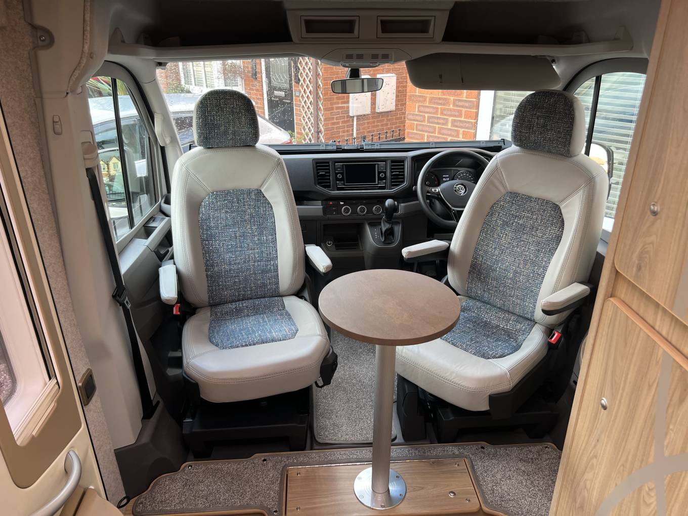 Behind the driver and passenger seats, which swivel, is further storage. It benefits from 8 speed automatic gearbox, VW multimedia centre including radio/ Bluetooth, Apple car play, parking assistance, and rear view camera. Remis blinds are fitted to all cab windows including windscreen which has 2 set positions.