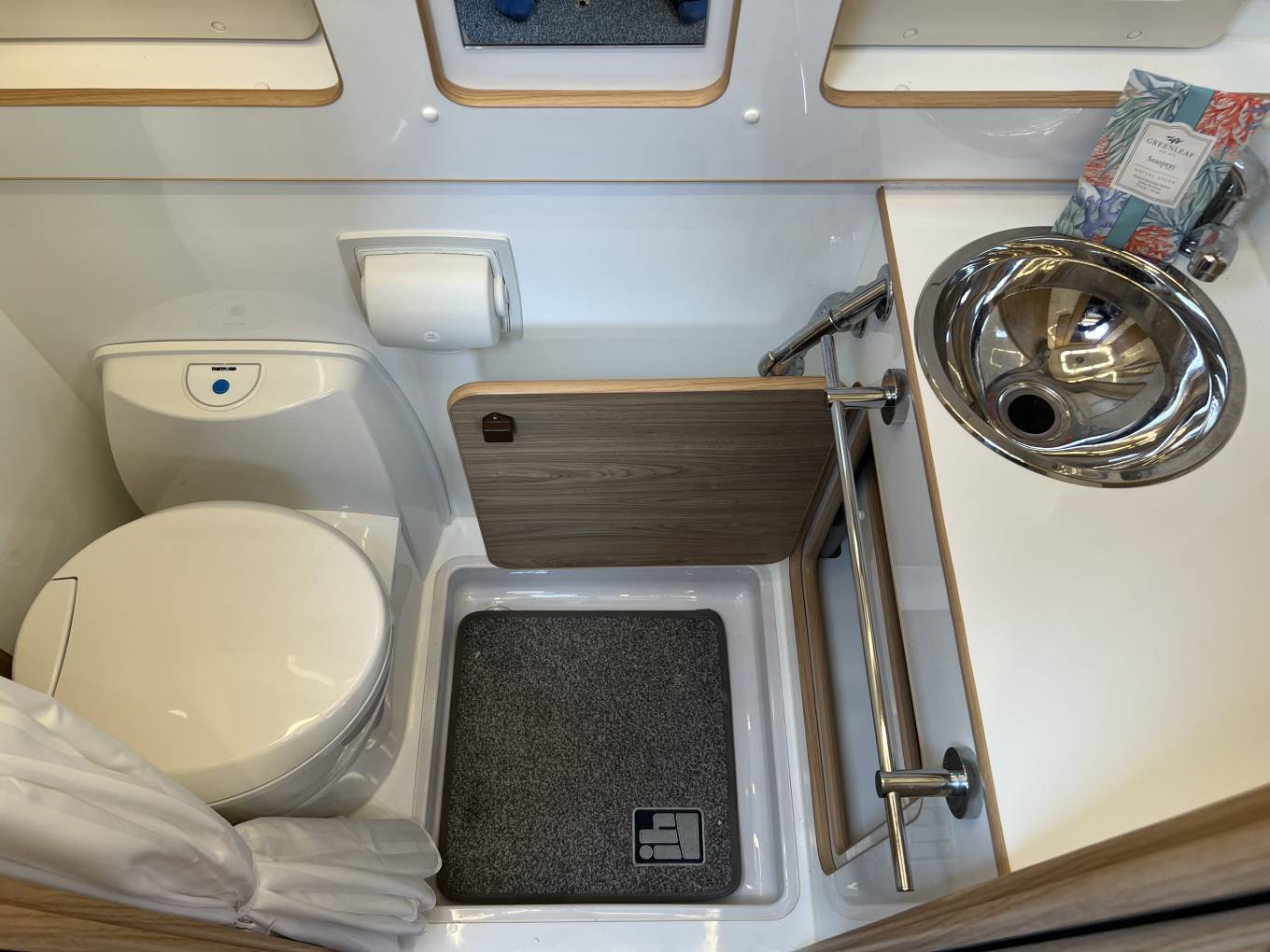 In the washroom, you will find a toilet, and opposite a sink, with storage underneath, then shower attachment; there is a weighted curtain