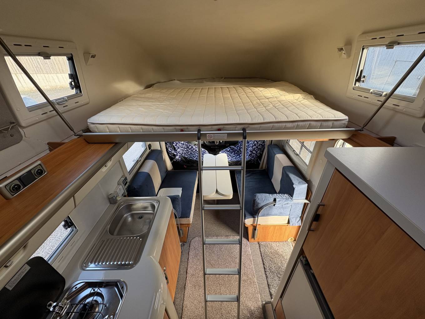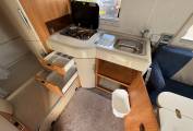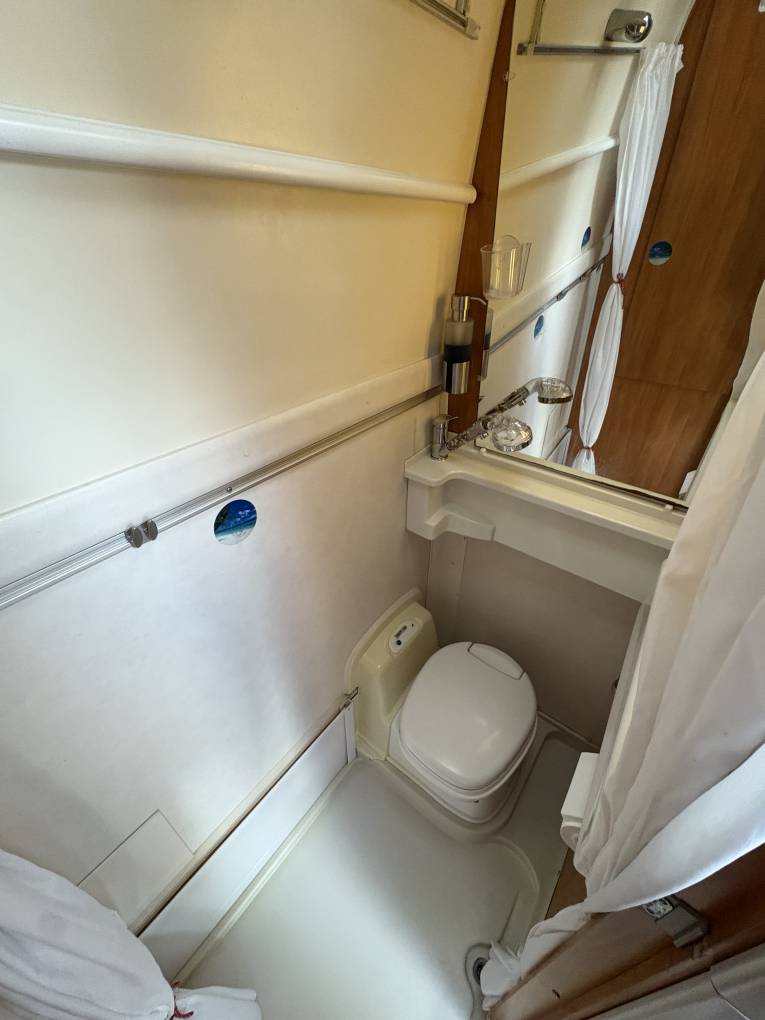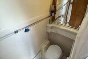 One of the standout features of the Exsis is its sleeping arrangements. The motorhome offers a large drop down bed, which can comfortably sleep two adults. The bed can be stowed away during the day to maximize living space but even when the bed is down you can still make use of the lounge area which is very rare when you have a large drop down bed. Additionally, the Exsis includes a compact yet functional bathroom with a toilet, shower, and washbasin, ensuring the new owners can enjoy full amenities while on the move.