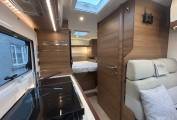 The sleeping areas include a spacious island bed located at the rear of the vehicle and a small lounge conversion. The island bed can be raised from the garage.