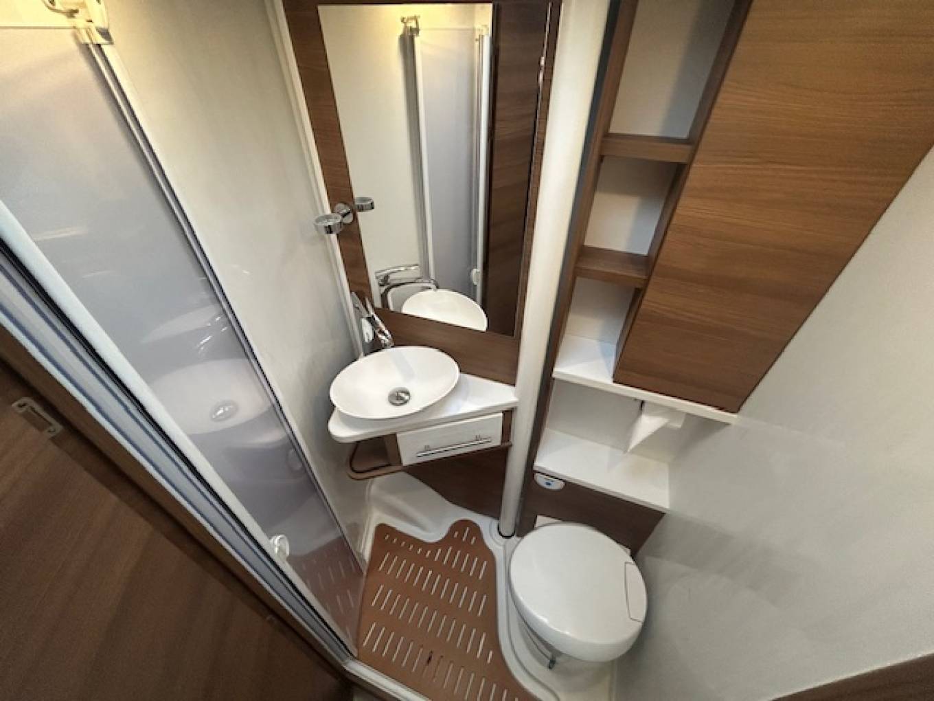 The washrooms layout includes a swivelling Thetford cassette toilet with storage directly above it. The tap, sink and mirror are beside this attached to a pivoting wall. When the wall is turned, it encloses the toilet space opening up the shower area to keep the rest of the washroom dry.