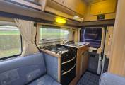 The layout is from opening the side door you enter the lounge & dining area from the electric step where you have a side sofa and forward facing single seat with three-point seatbelt fitted with two large side windows and two upper side windows & HEKI II wind-up sunroof floods the area with natural daylight. The passenger front seat swivels and there is a large & small dining table. This area at night can be made up into two single beds or a large double bed and there is plenty under seat storage and an overcab cabinet for storage also. Moving to the rear you have the kitchen which has a 3 gas burner hob with glass lid, gas grill & oven beneath, large stainless steel sink with draining board and glass lid and a mixer tap underneath you have a 3-way powered fridge with ice-box plus upper & lower cabinets to store all holiday provisions. The washroom has a shower tray, shower handset & curtain, the wash basin pulls down and has a mixer tap, Thetford cassette toilet with electric flush and the door extends to make a privacy room at the rear.