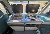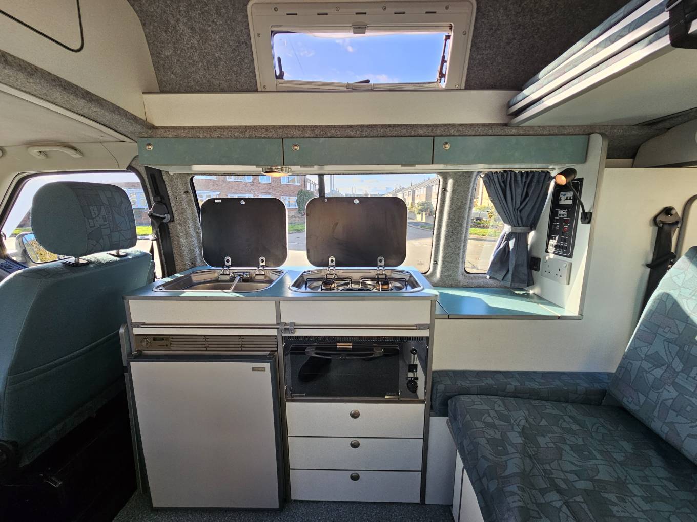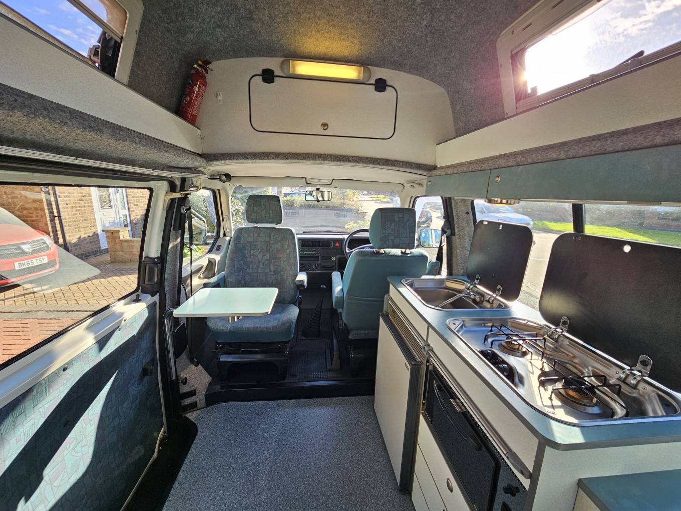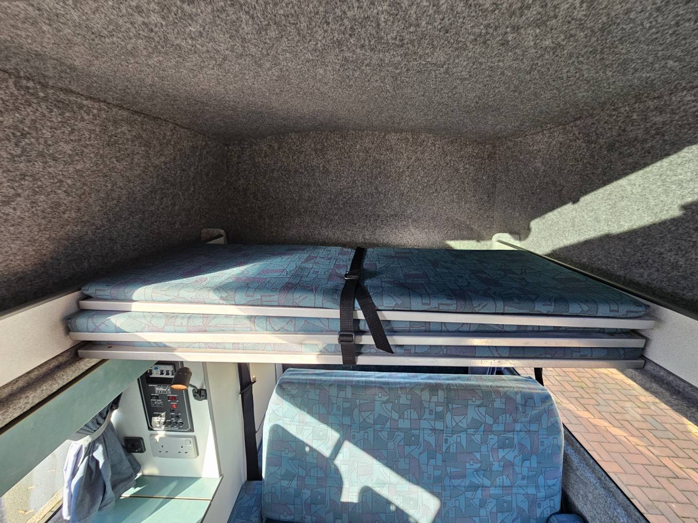 Inside, the classic Bilbo’s layout offers timeless practicality and quality. There’s a full length side kitchen featuring a sink, Smev 2 burner gas hob, Smev grill, and a Dometic fridge/freezer, along with a 12v TV point, 2 x 240v sockets, and a central power control panel. Opposite, the rock and roll bed folds down into a comfortable double, while the overcab high top area offers a second double bed with windows on both sides, ideal for light and airflow. The upholstery and surfaces are in very good condition throughout, and there’s great headroom thanks to the factory high top. Curtains on all windows ensure privacy, and the passenger front seat swivels to join the living space.