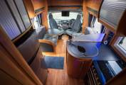 Lounge Area - The classic opposing benches create a spacious walkway throughout the vehicle, whilst the circular centre dinette table moves out of the way to enhance space. When its ready for meal times, the drop down TV in the cab and Captain's swivel seats, open up this space as a perfect dining area for the family, with ample entertainment options.