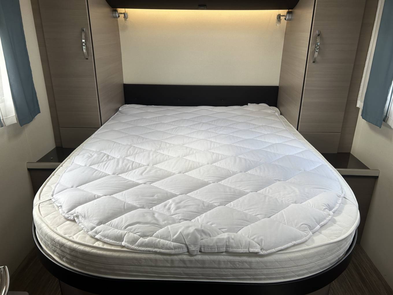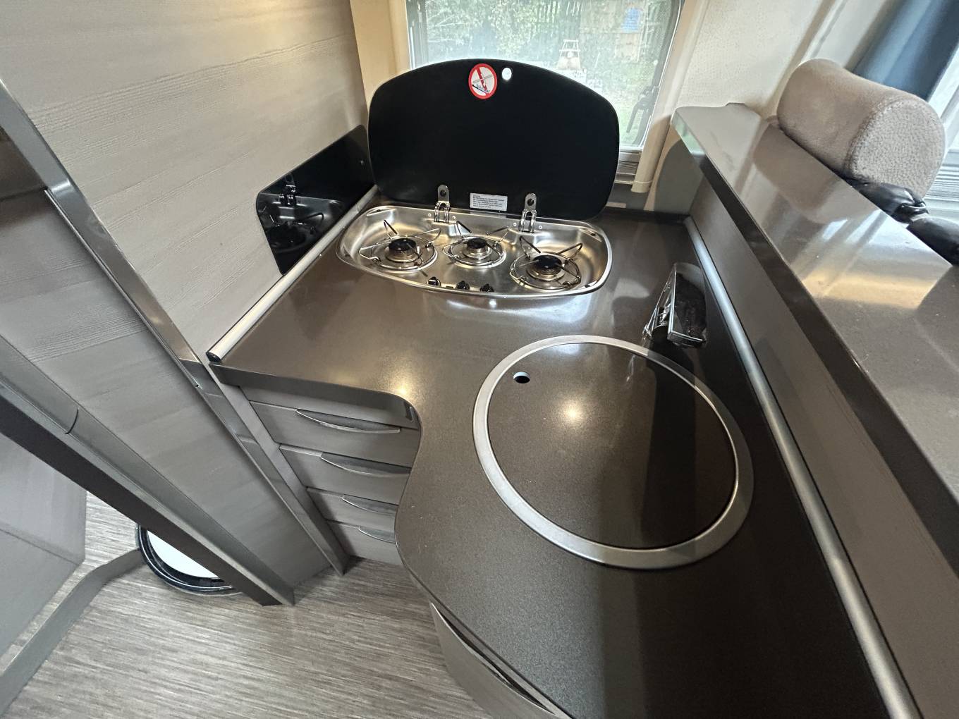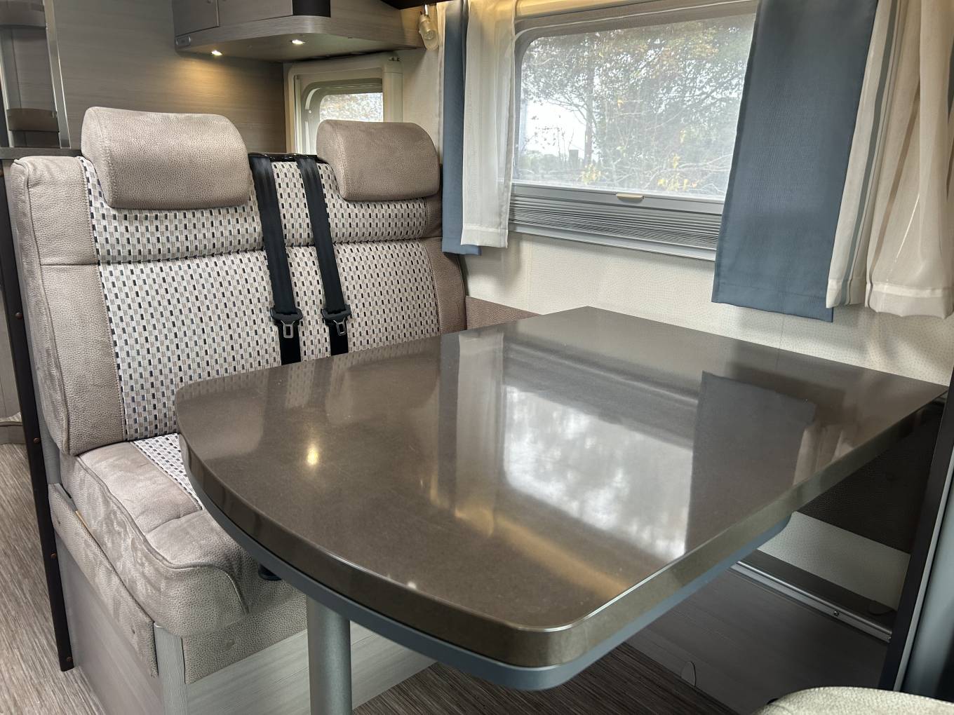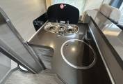This Hobby is built on the Fiat Ducato chassis and has a 2.3l engine with 6 speed manual gearbox and 130 BHP. It comes with Cab air conditioning, cruise control, sat nav and a reversing camera. The motorhome has had a recent cambelt change, has been serviced and had new tyres in the last couple of years.The internal layout of this Hobby gives you a fantastic living space. At the front you have a spacious front lounge area that is made up of 2 Captains Chairs, one double front facing sofa and a further single side sofa. There is a removable table that can further extend to give an ideal space to entertain. Moving back the motorhome has a continental style kitchen featuring a gas hob with 3 burners, sink with mixer tap and large fridge with ice compartment.